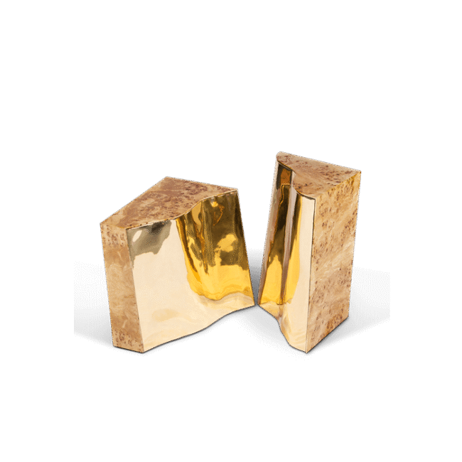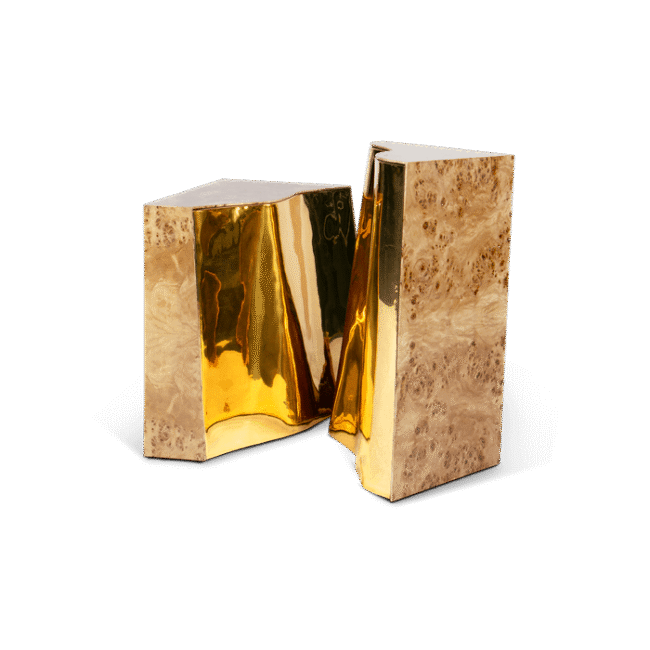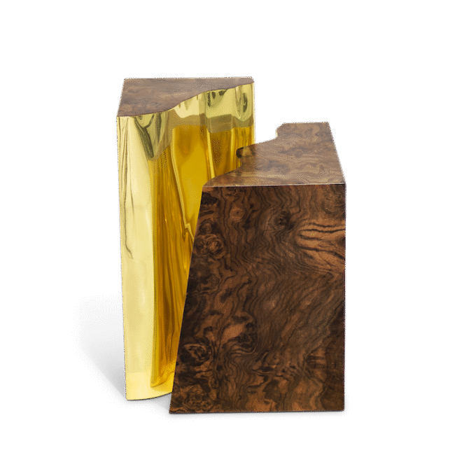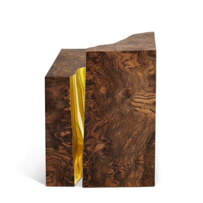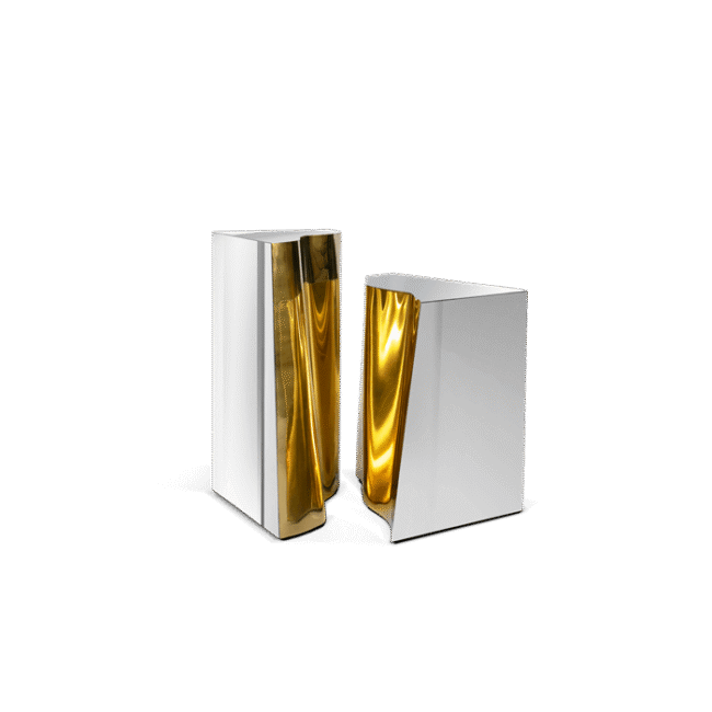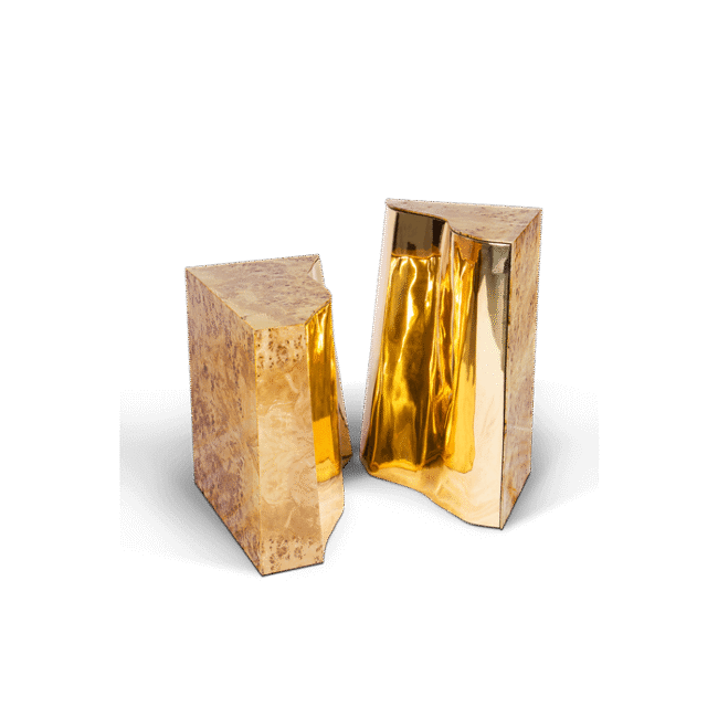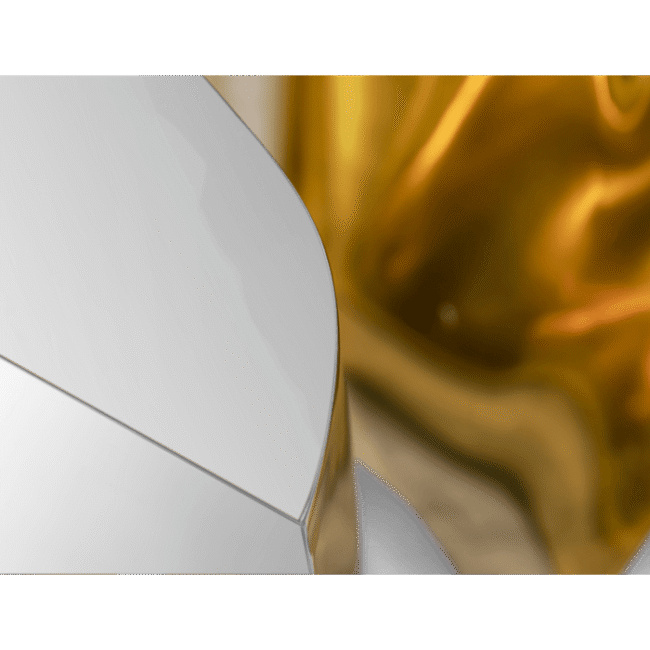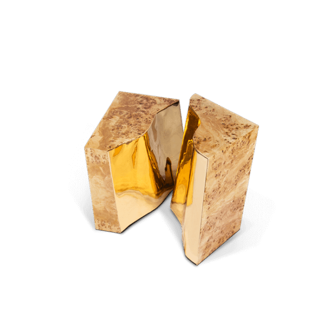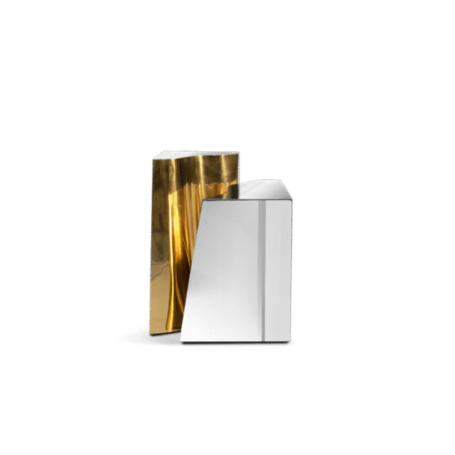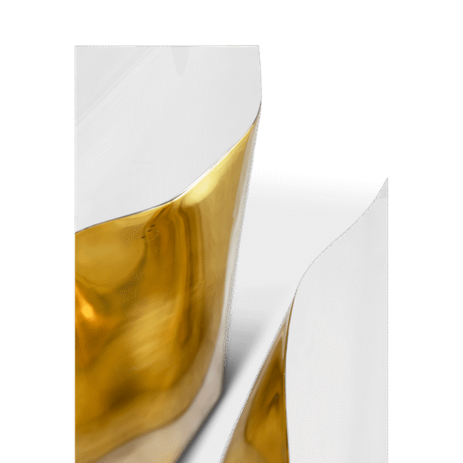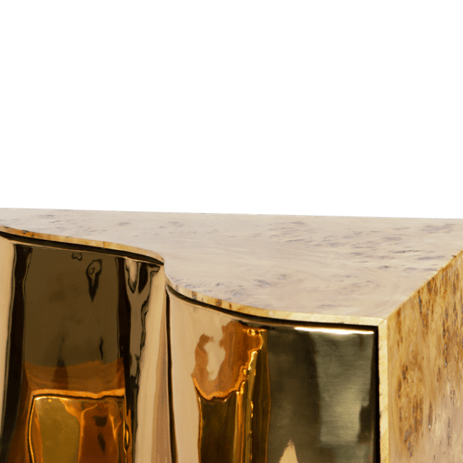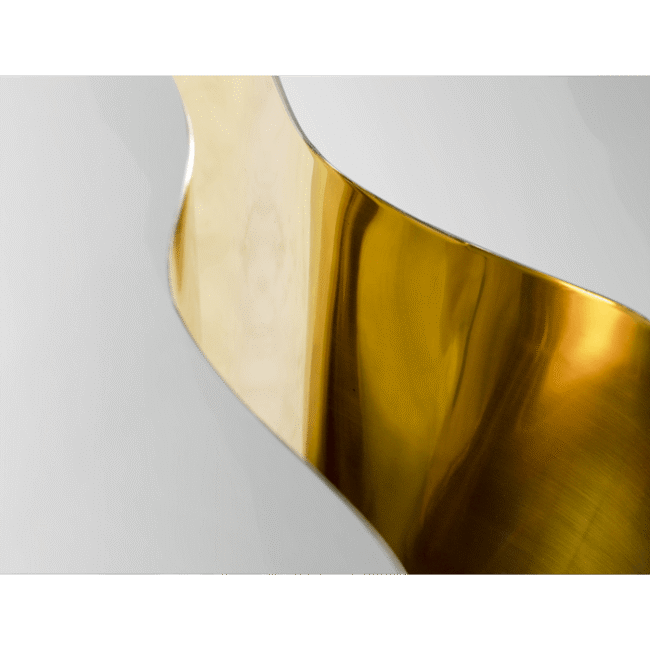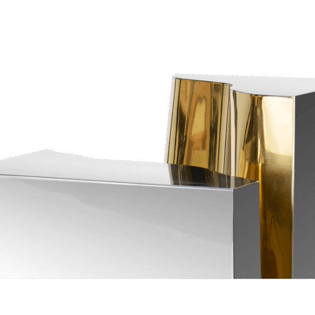 Its organic features are achieved through the manual fitting of the polished brass sheet, and a sharp exterior finished in polished stainless steel that portrays a perfect mirror. The hammered brass details and mirrored sides convey both dynamics and elegance, a beautiful duality between power and refinement to bring a new contemporary verve into interior design.