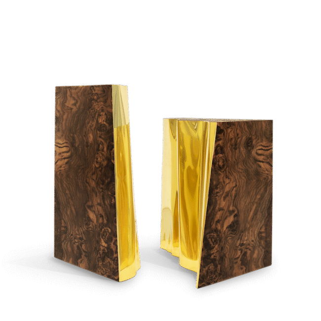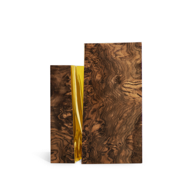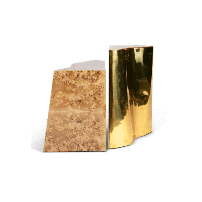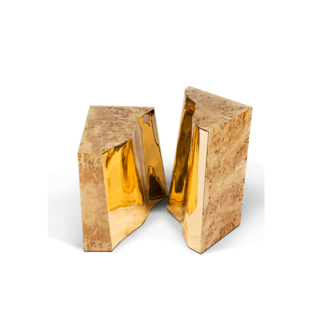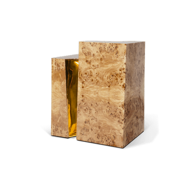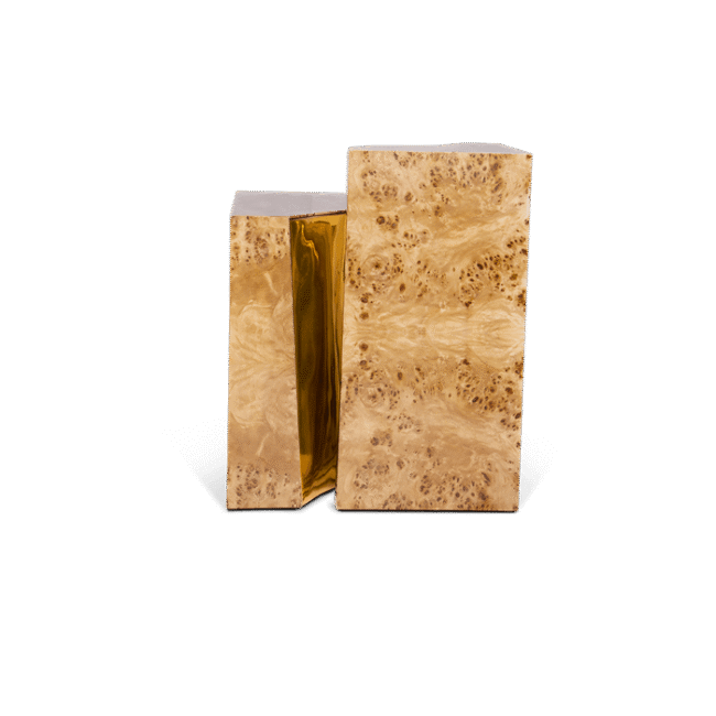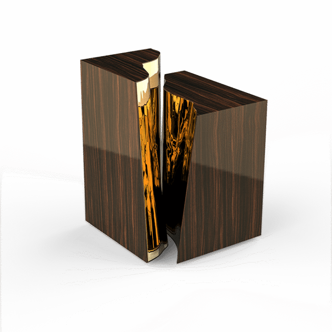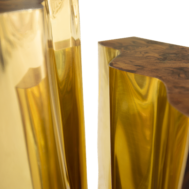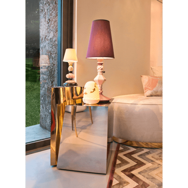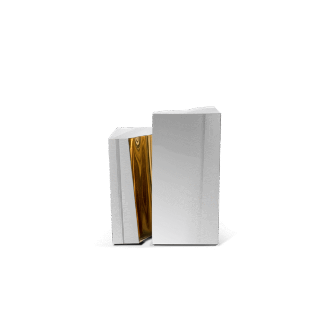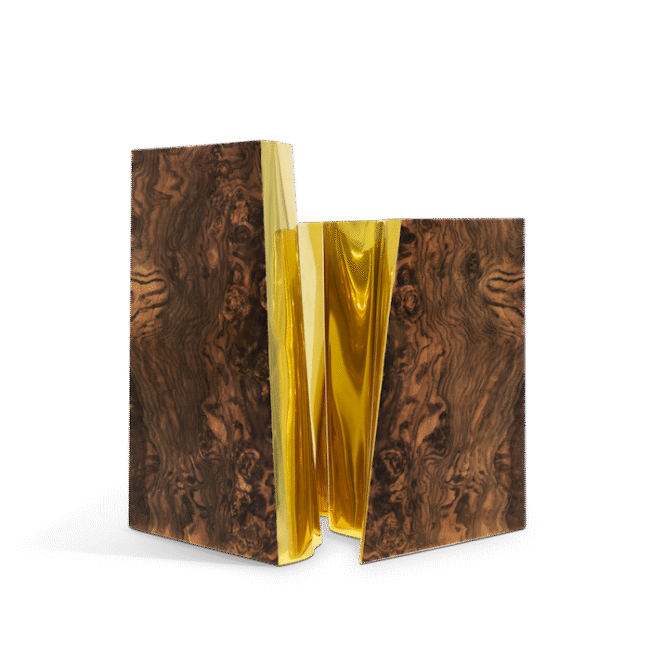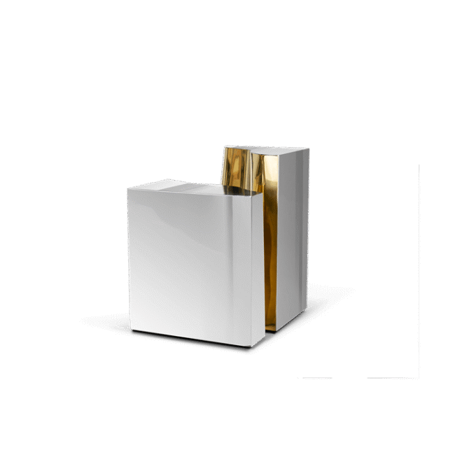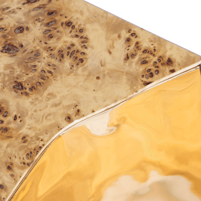 Its organic features are achieved through the manual fitting of the polished brass sheet, and a sharp exterior finished in polished stainless steel that portrays a perfect mirror. The hammered brass details and mirrored sides convey both dynamics and elegance, a beautiful duality between power and refinement to bring a new contemporary verve into interior design.