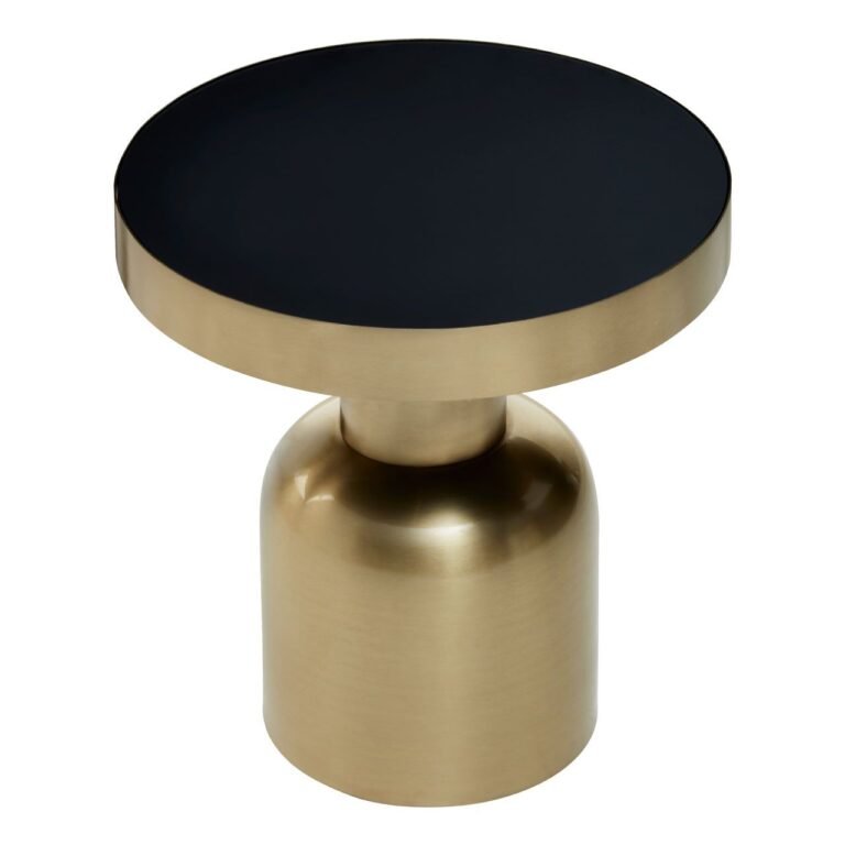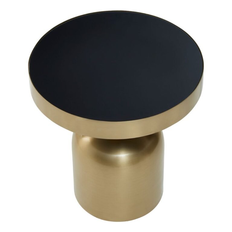 Lorel Side Table With Circular Glass Top: Sleek and sculptural, the Lorel side table is made from iron and glass. The lower part of this table exhibits a warm metallic finish completed by a round glass top.
