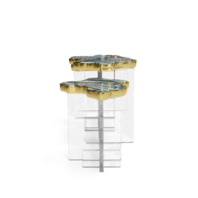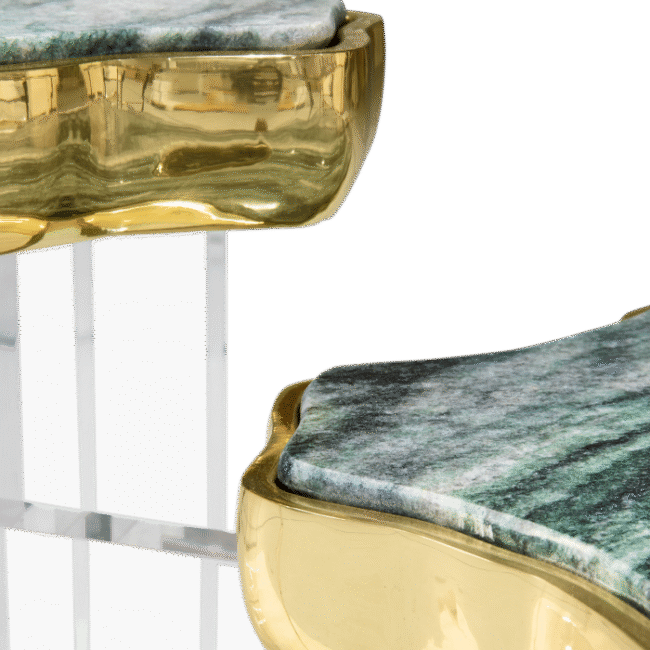 Depicting nature in an innovative way, the Water Lillies series are gently brought to life in an elegant coffee table with a multi-layered marble surface enveloped by cast brass with a unique textured finish. Featuring both contrasting shapes and materials, as the unconventional compositions of the artist, the elegant side table is supported by a geometric acrylic base, allowing to capture natural light. An immersive exceptional objet, the Monet side table is perfect for cutting-edge rooms.