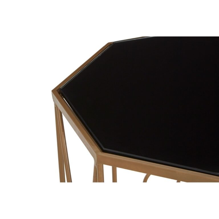 Mossley Set Of 2 End Tables: Each of these two end tables has a hexagonal, black glass top that neatly rests on a slim frame. The black glass is contrasted by a rich copper finish that makes the tables easy to coordinate with warm metallic accessories and lighting. The cross style on each side of the base incorporates a circle to create a juxtaposition with the straight lines.