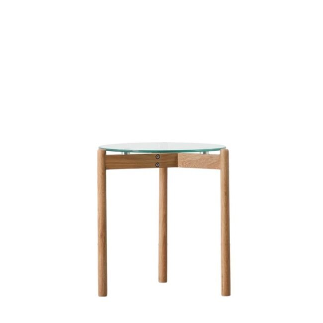 Lovely oak side table offering a stunning contemporary style. It features a beautifully designed solid oak base combined with a tempered clear glass top. A matching coffee table is available, and both are also offered in a black oak finish with a smoked glass top.