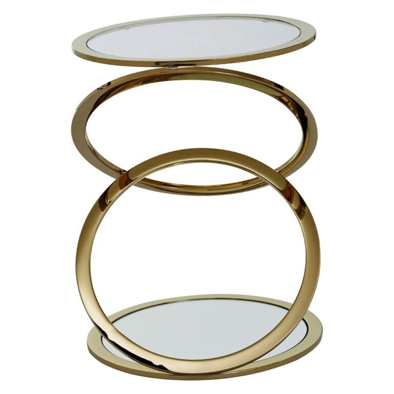 Lynwood Clear Glass End Table With Warm Metallic Frame: The base of this modern end table consists of interconnecting gold rings which create a dimensional interest from every angle. The tabletop is clear glass encased in gold finished stainless steel.