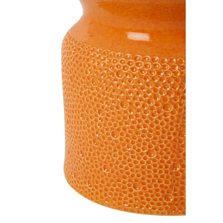 This Oriel Orange Ceramic Table is a tale of two parts, with a smooth upper section contrasted with the textured, dimpled lower. Made from ceramic, it has a sleek glazed finish and a bright orange colour. It adds a boho traveller accent to interiors.