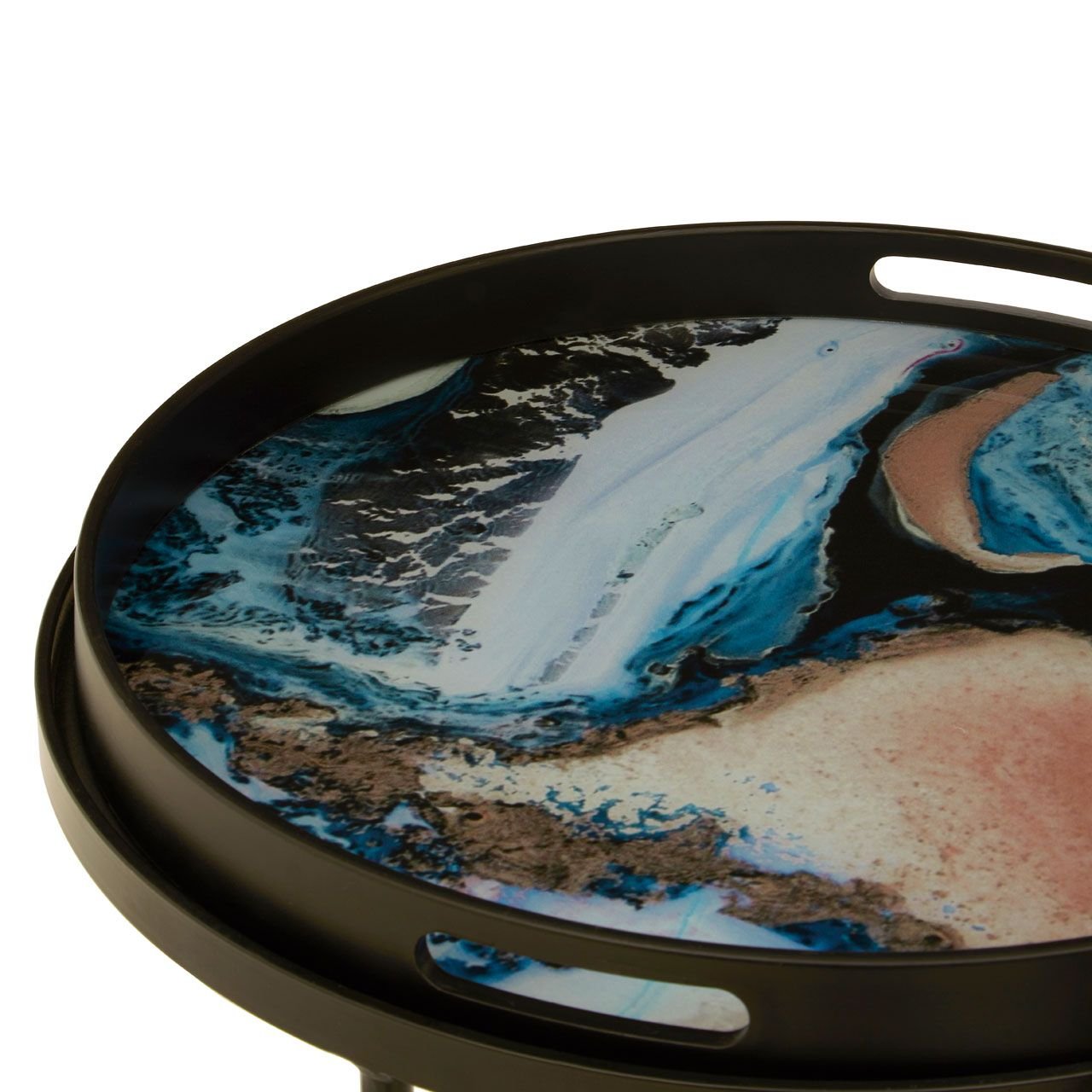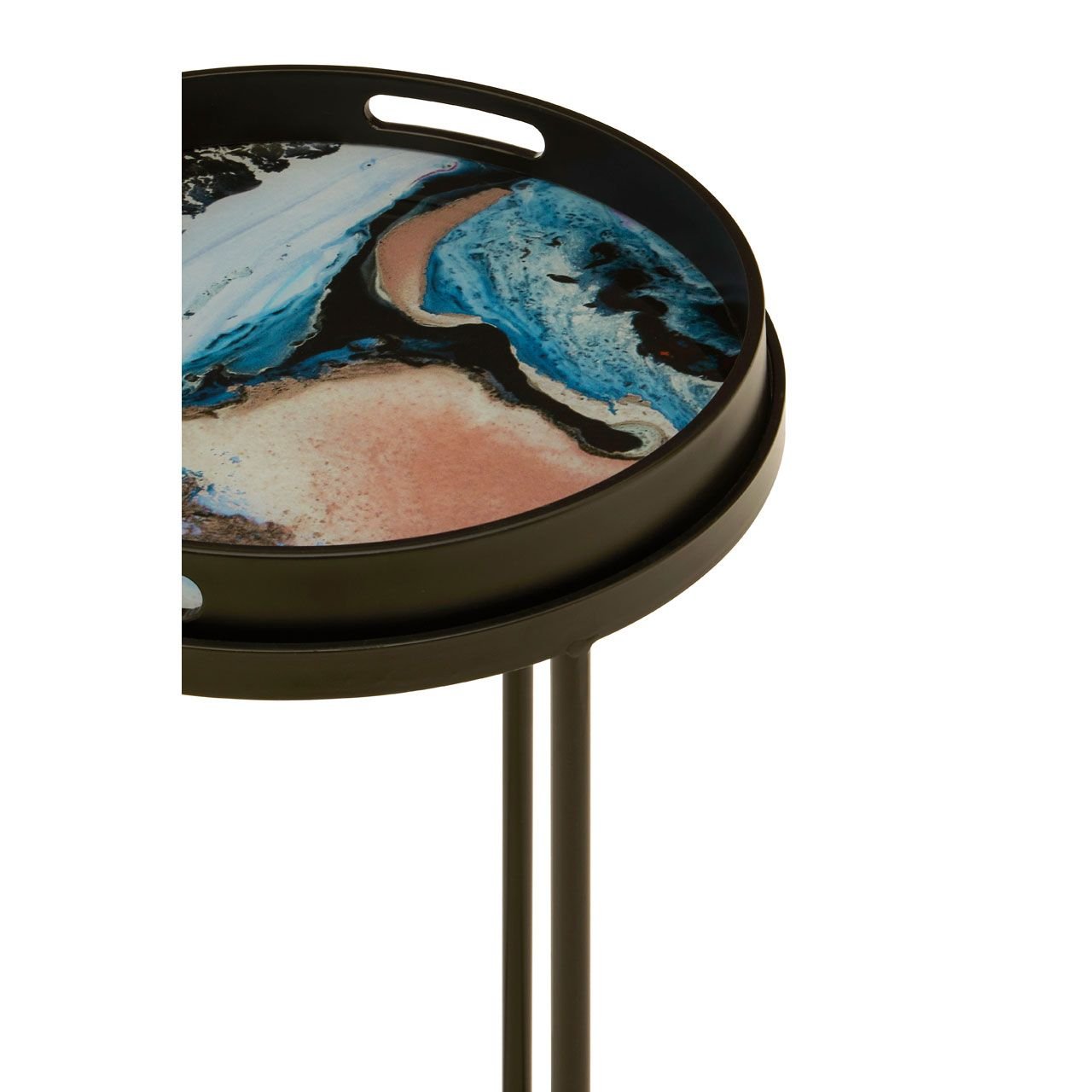 Pelina Set Of 2 Pink / Blue Nesting Tables: Stylish and functional, the Pelina tables feature a minimal design, with black finish metallic bases and round tops. Each of these tables has a removable tray that neatly sets in the frame. The cut out handles on the raised sides of these top trays are designed to let them be lifted out of the frame when required.