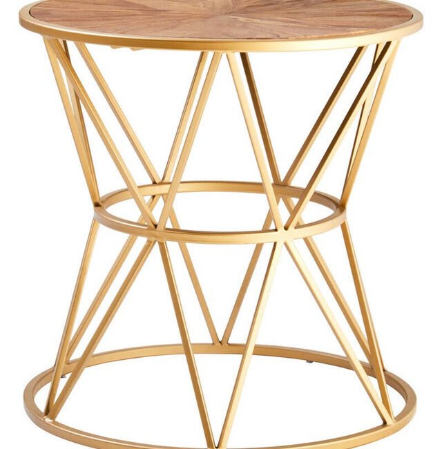Circles and triangular shapes enhance openwork warm metallic base of this side table. The natural round elm wood sits above the geometric frame and contrasts the luxe accent.