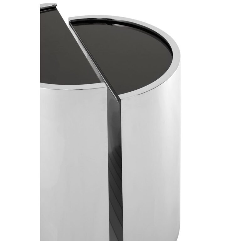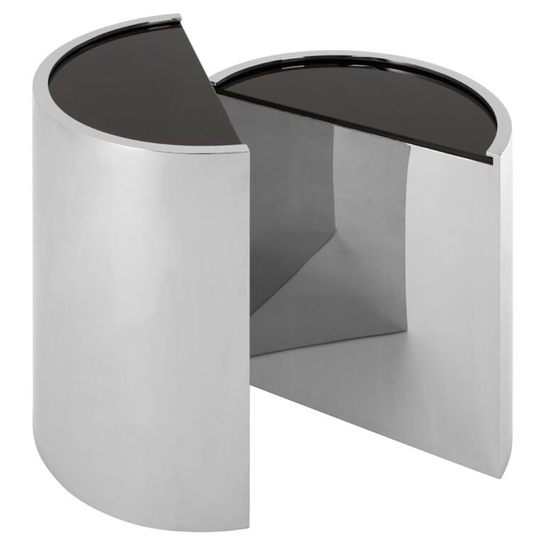 Piet Set Of 2 End Tables: These sleek, contemporary end tables are crafted from smooth stainless steel with a reflective silver finish. Both tables feature a semicircular black top made from glass. These two tables can be placed together to create one full circle, with one end table slightly shorter than the other for a modern twist.