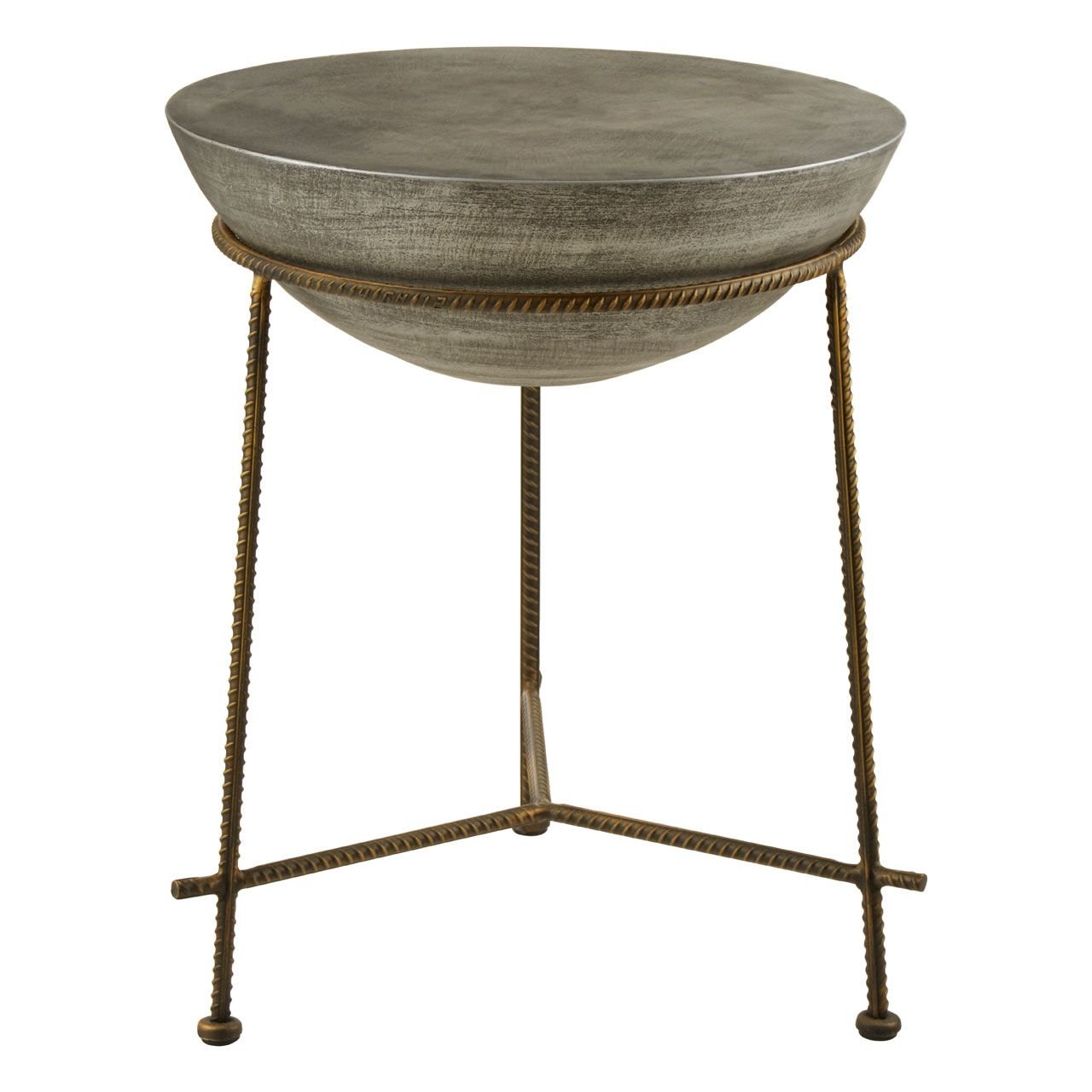 Poma Round End Table: The Poma end table features a three-legged base formed from strong iron. The base is textured with small ridges and boasts an antique brass finish that lends the end table a weathered aesthetic. Supported by the base is a hemisphere tabletop that is created from richly-textured concrete, with an antique silver finish to harmonize with the finish of the unique base.