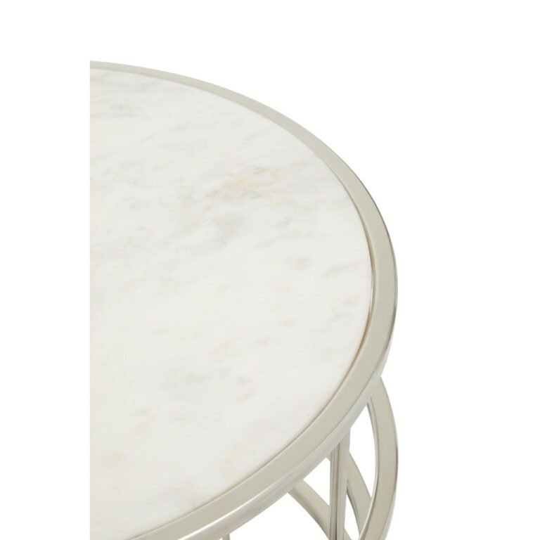 Radclife Marble Top Side Table: Exhibiting artisan craftsmanship, this side table has a round white marble top that is perched neatly on an open-frame silver finish metal base. The fusion of marble and steel creates a chic statement in the living area.