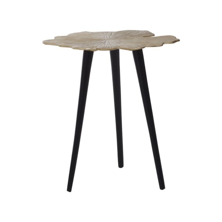 The Ralkie Ginkgo Small Side Table has a ginkgo leaf design top accented in the luxe gold finish. The decorative top sits above black angular legs which enhance mid-century modern styling.