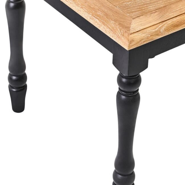 “This side table has an oak wood top covered with a thin layer of oak veneer that adds durability. It has turned legs made from strong birchwood, with a black finish that accentuates their knopped and pillared design. The birchwood undershelf offers extra space.”
