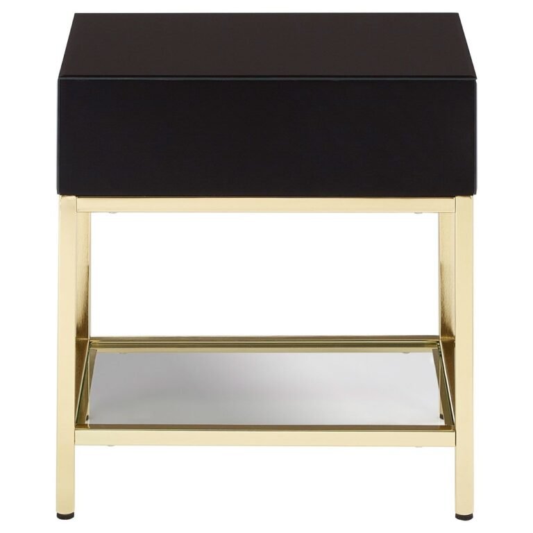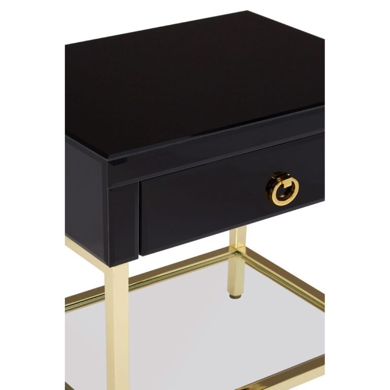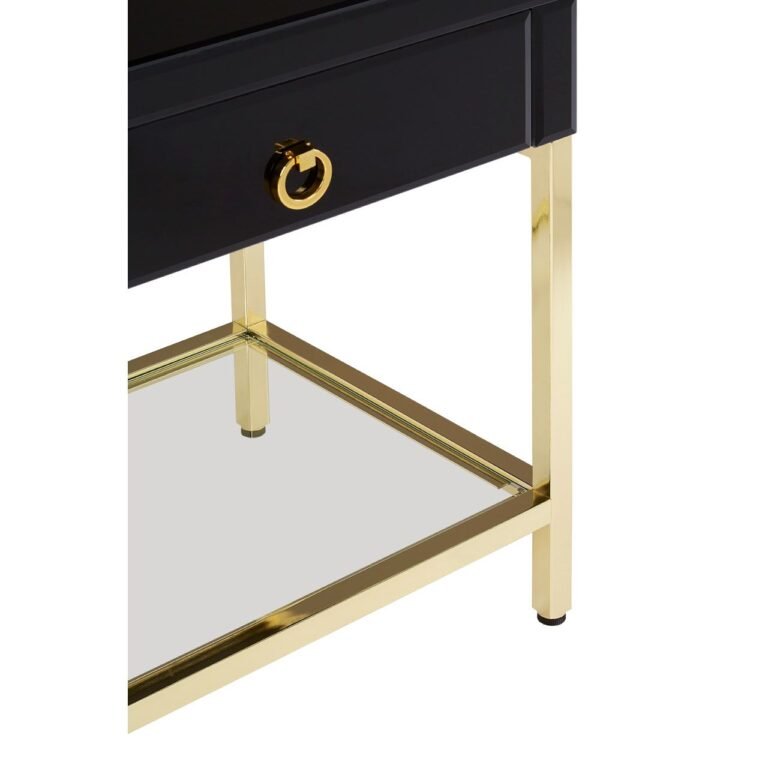 Regents Townhouse Gold Finish Side Table: The Regents Townhouse side table has a glossy black cabinet with a gold finish ring pull handle on its drawer. Its legs are made from gold coloured iron, and the display surface is covered with mirrored glass.