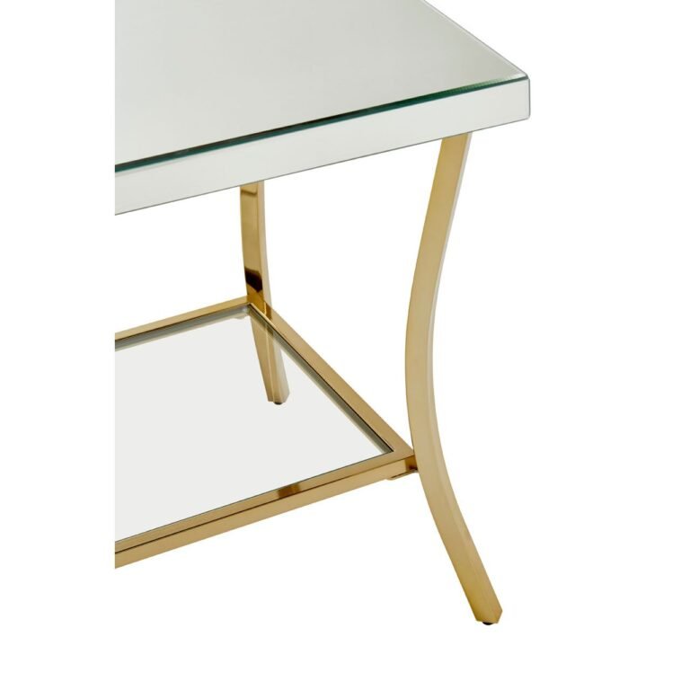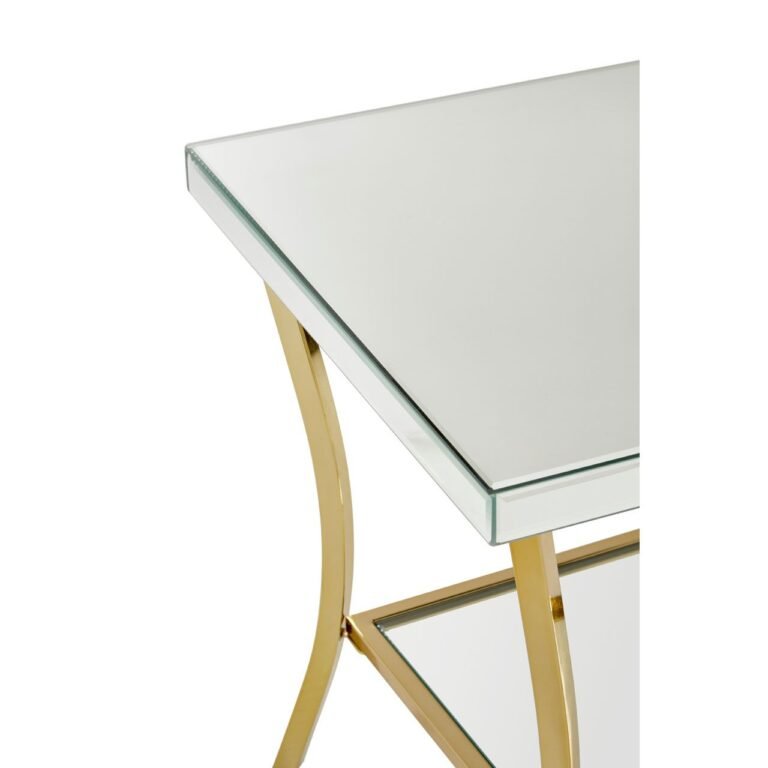 Regents Townhouse Silver Mirror Side Table: The Regents Townhouse side table has gently curving iron legs with a reflective gold finish. A square of mirrored glass is added to the bottom, offering a reflective complement to the table’s mirrored glass top.