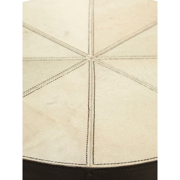 Regents Townhouse Tall Iron Side Table frame of the round tabletop is made from eco-friendly mango wood and is dressed with genuine white and brown leather. A series of stitched lines create a wedge design on the table’s top surface. These lines complement the tubular iron bar legs that descend from the top and angle at the bottom to produce a circular base.