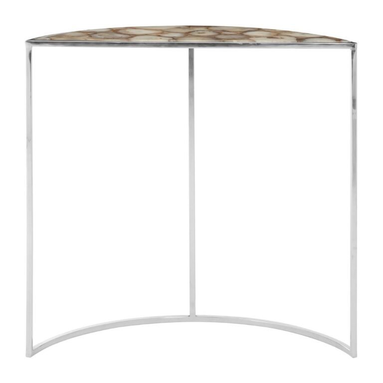 Ridge Half Moon White Agate Top Table: Its frame is made from sleek steel and has a flowing half-moon design that allows it to be displayed flush against the wall. The minimal steel is given a silver finish that adds to this table’s refined and luxurious look. Its crescent tabletop is inset with semi-precious white agate stone, polished to make it smooth to the touch.