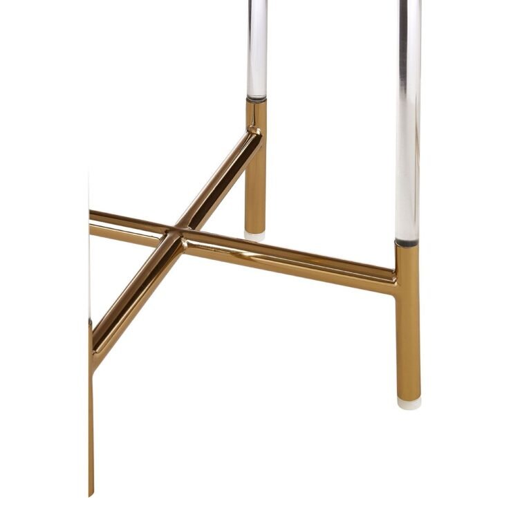 Sporting a minimalist design, the Riley Side Table has a clean lined, cross design base of acrylic and rich gold finish steel legs. A clear acrylic round top with smooth edges neatly sets on its frame giving a modest counterpoint to the reflective, warm metallic accent. Style this accent piece with luxe-design furniture and acessories.