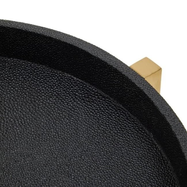 “The Rodoba Set Of Two Black Shagreen Tray Tables have contrasting brushed matte gold finish legs which are joined at the base, providing stability and sturdiness.”