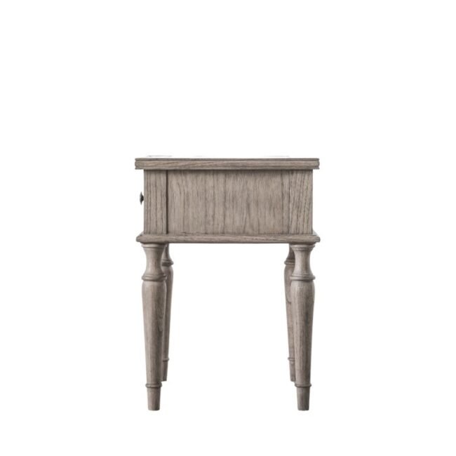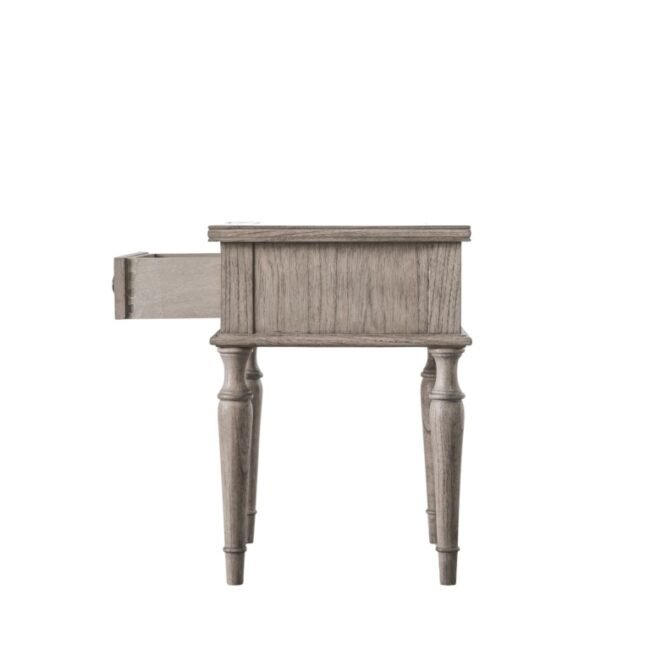 With a nod towards the french colonial style this 1 drawer side table is made from mindy ash and features parquet inlaid vaneer work in a lightly brushed natural finish.
