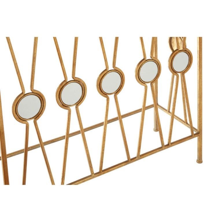 Stritz Set Of 2 Rectangular Console Tables: This set of two console tables boast frames made from slightly weathered metal that has a rich gold finish. Their combination of angular and circular lines is inspired by art deco design, with small mirrored accents for a reflective touch. Each one has a top made from glass, coloured black to complement the gold.
