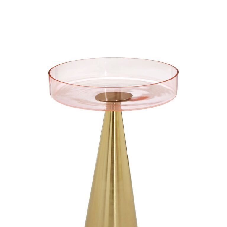 The Sunning Small Side Table’s round top is made from pink-tinted glass that feels light, airy and chic. The table’s distinctive base tapers upwards, resulting in a striking conical shape. The base is finished in a rich gold tone, enhancing the table’s luxe appeal and lending it well to interiors with warm metallic accents.