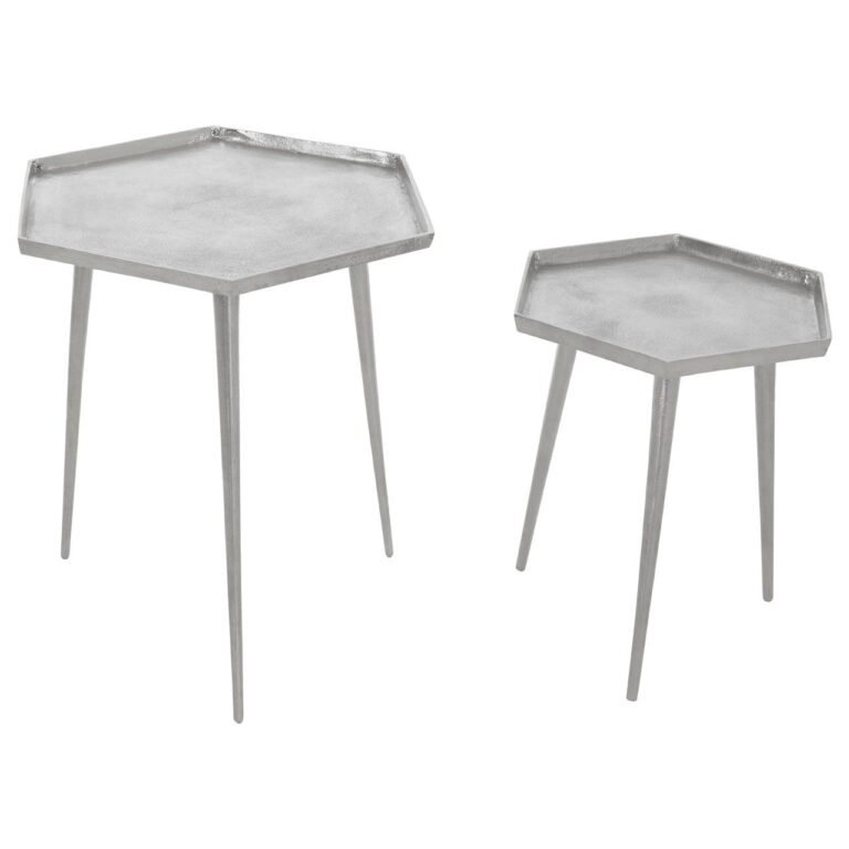 Tallie Set Of 2 Hexagonal Side Tables: This pair of tables has a simple, geometric design featuring hexagonal tray tabletops and sleek, splayed, pointed legs in matching metallic silver finish. Each table is subtly textured for a decorative visual appeal.
