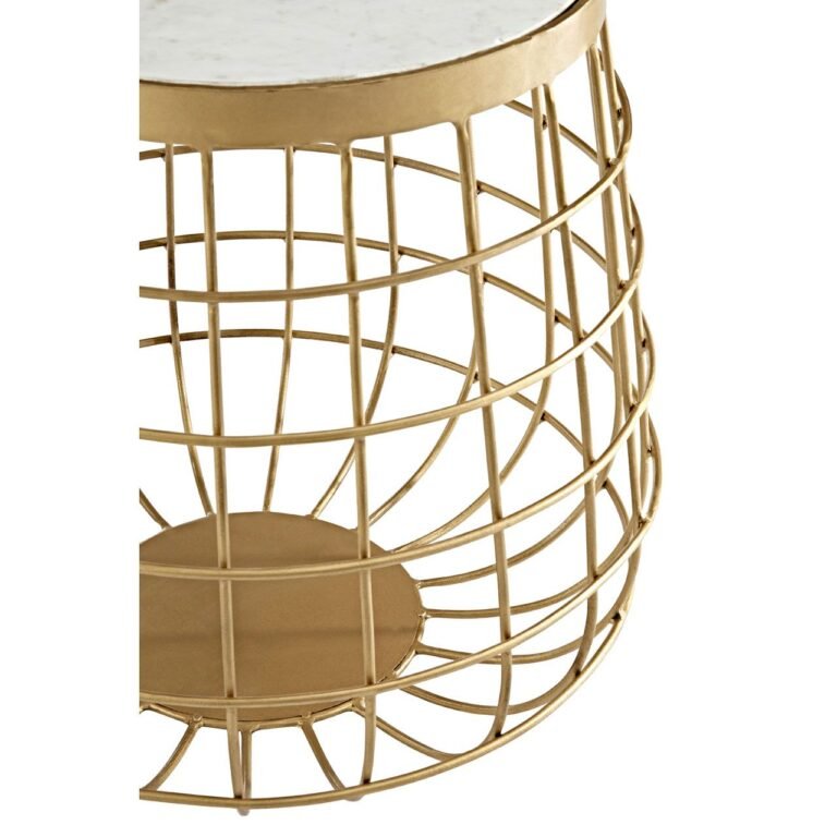 Tiston White Marble Top Side Table: A circular piece of solid marble is set into the round iron clasp at the top of this luxury accent table’s base. The marble’s dark swirls and veins offset its white colour. The ironwork tapers outward from the marble, curling in at the base to meet a round solid iron plate. It has a warm brass finish to complement the white marble.
