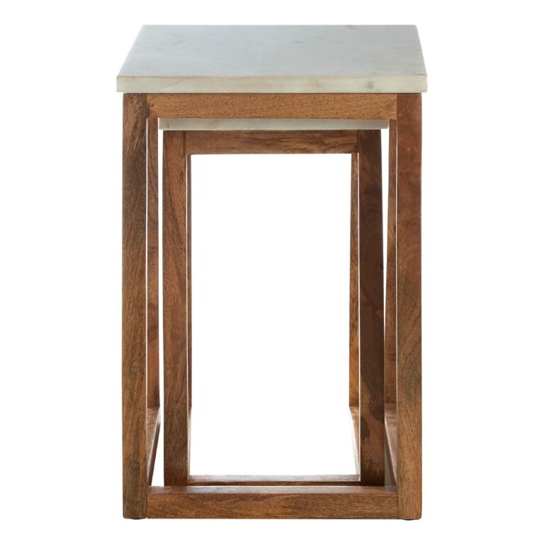 Tiston White Marble Tops Tables – Set Of 2: These nesting tables use simple design lines to help them achieve their clean look. The legs are made from sustainable mango wood and angle at the front to contrast with those at the rear. They boast a rich brown colour with flecks of dark graining throughout that complements the dark swirls and veins on the white marble tops.