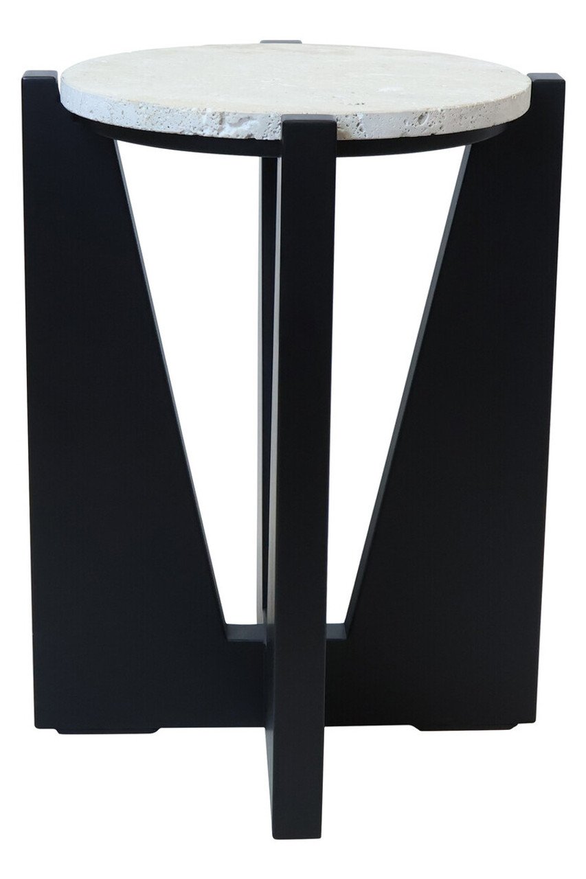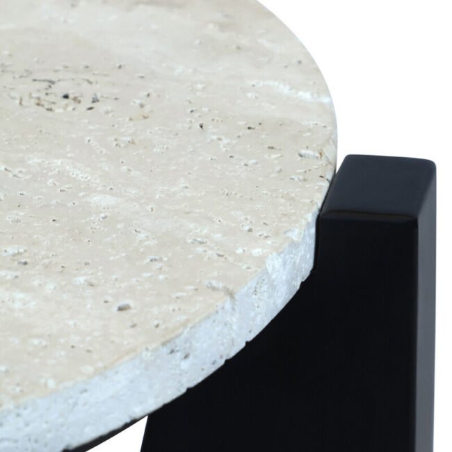 Towwin Travertine Top Side Table With Acacia Wood Frame: The Towwin travertine top side table blends modern geometry with the elegance of natural materials. The travertine top, a natural limestone known for its fibrous texture and earthy, neutral tones, makes each table distinct. Supported by a rich black acacia wood frame, the angular base design adds a contemporary edge while ensuring stability and durability.