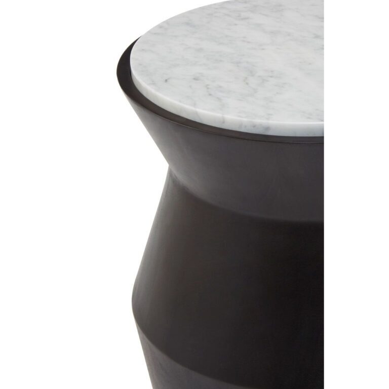 Reinterpreting the traditional drum side table, the Westbury Large Black Drum Side Table is sculptural and distinctive. The table tapers inwards and outwards creating an angular design that echos an asymmetric hourglass. The unique base is finished in a rich tone of black, while a slab of luxurious white marble provides a light counterpoint.