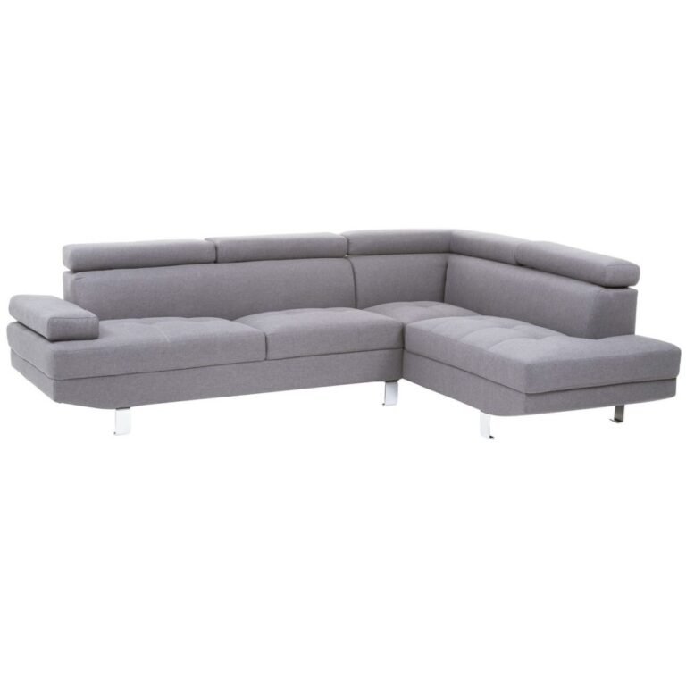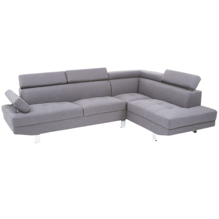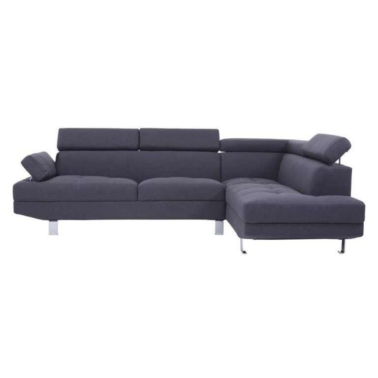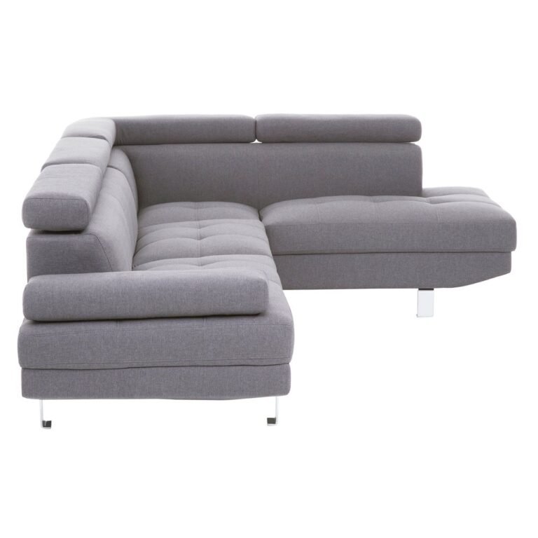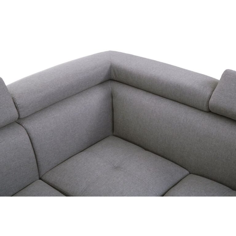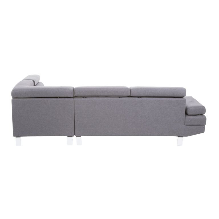 This Alover Large Grey Linen Sofa has wide button tufted seat in dense padding creating comfortable undulating suspension. The tapered backed sofa has neck supports, slanting arms and right recliner and is suspended upon chrome feet.
