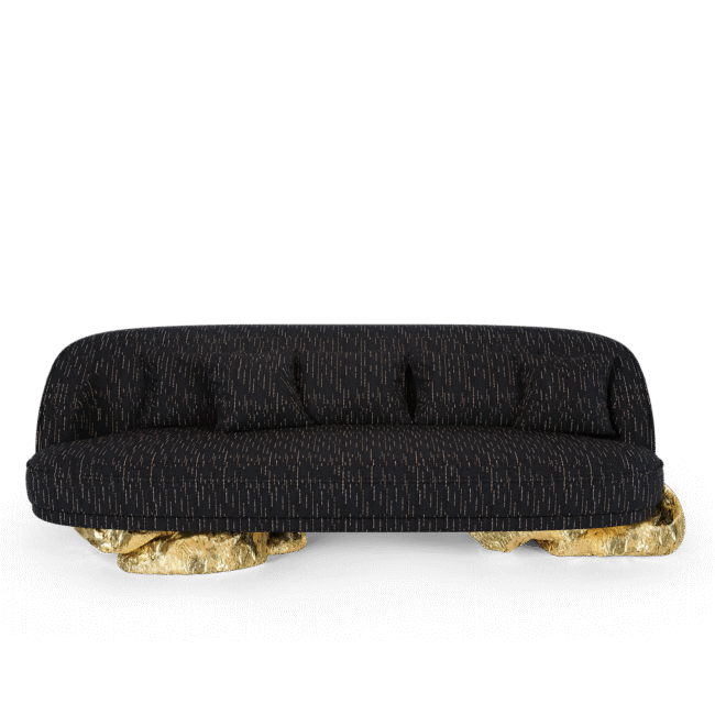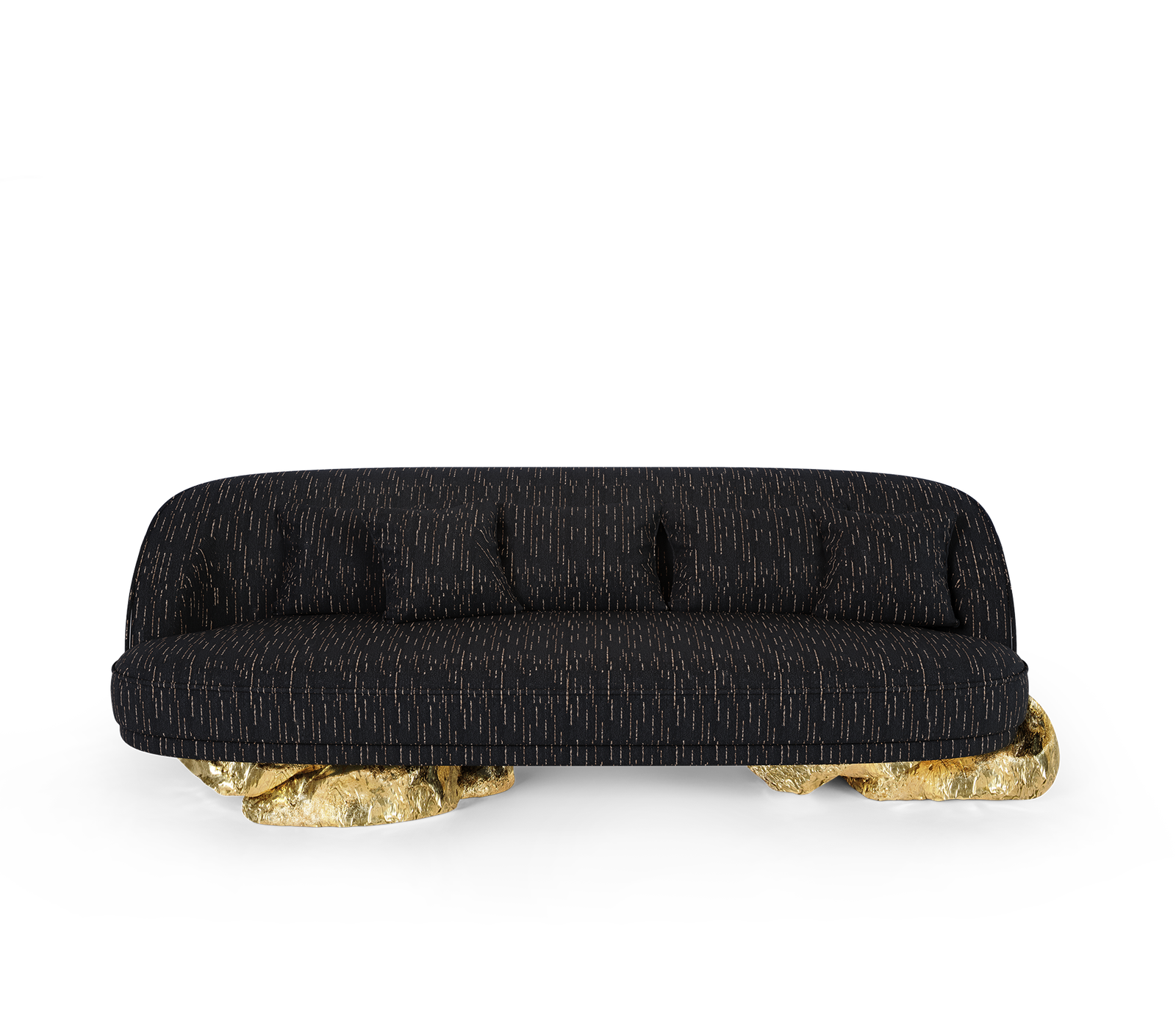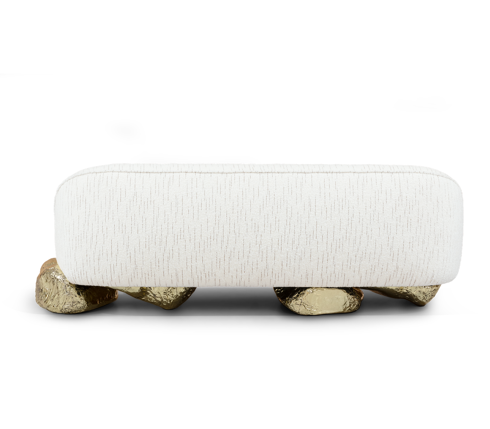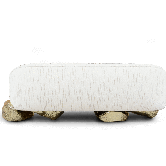 Wood structure upholstered in polyester with foam inside and base in polished hammered brass.