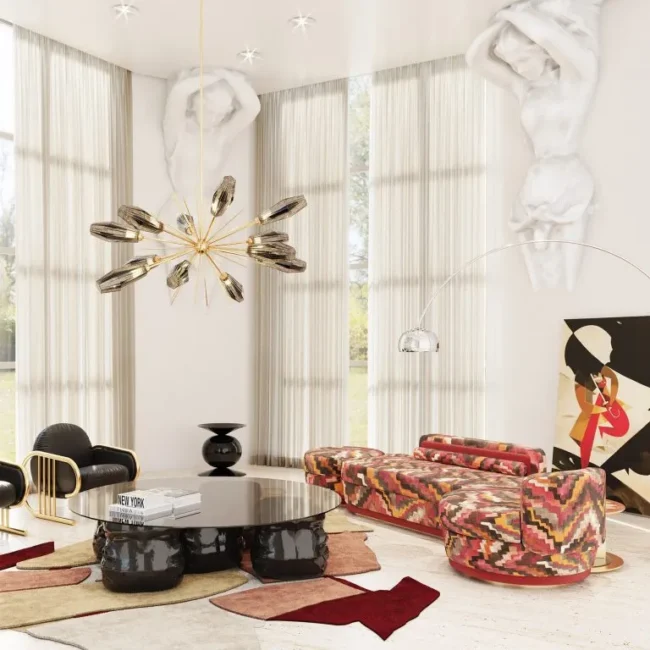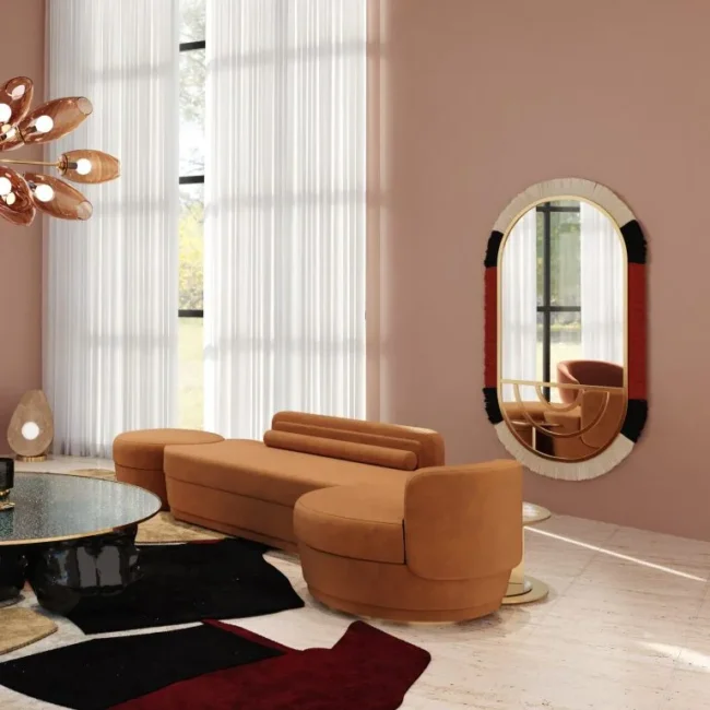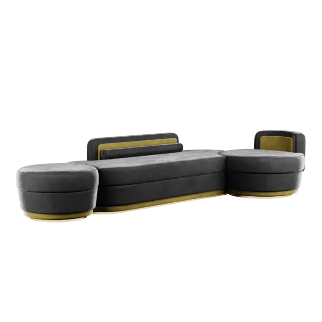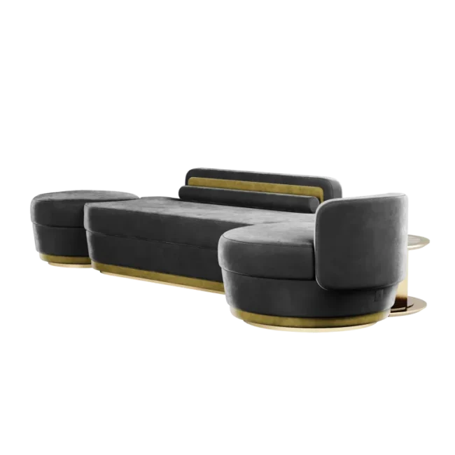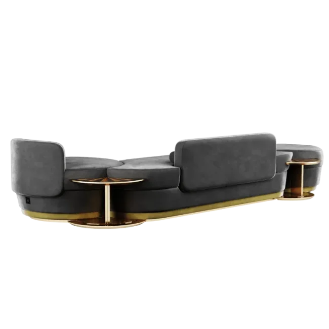 Cluedo Sofa is a Memphis design style sofa. A curved modern sofa upholstered in velvet, with surprising side table marquetry details incorporated. A luxury sofa offers a modern vibe to any contemporary living room project. Cluedo Sofa