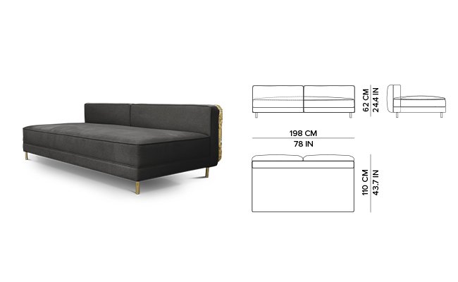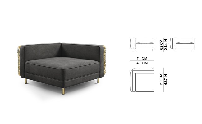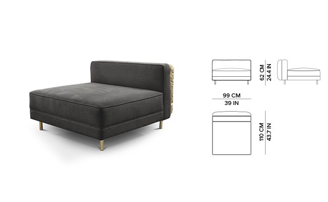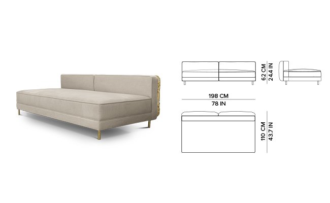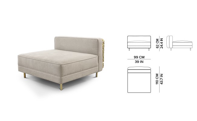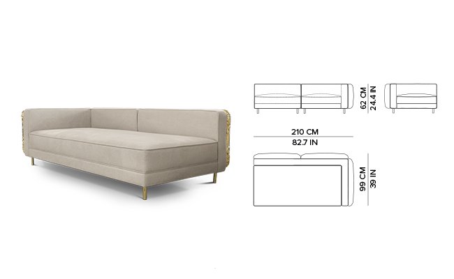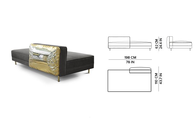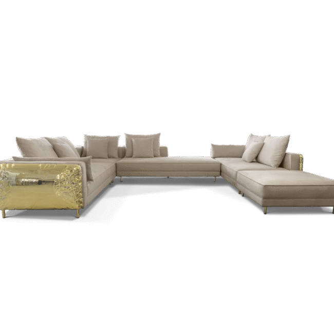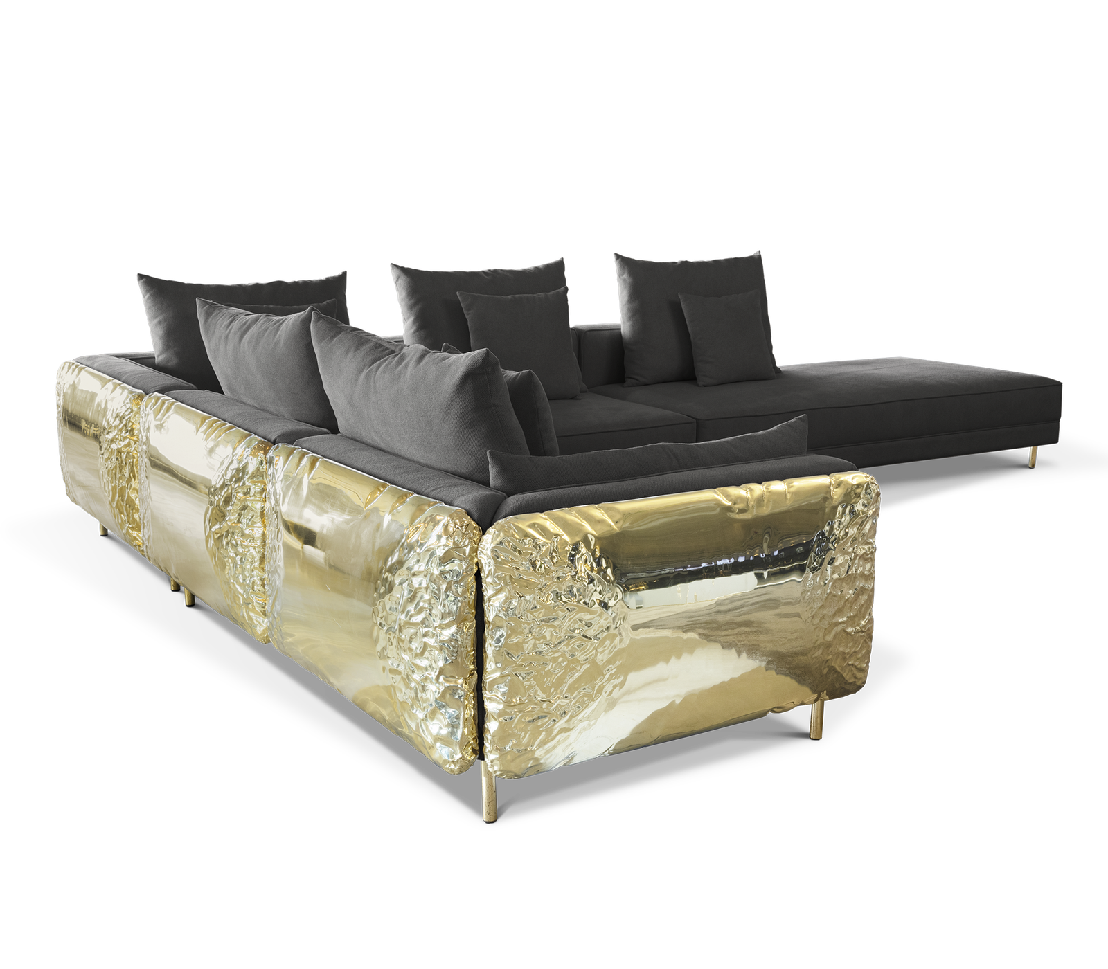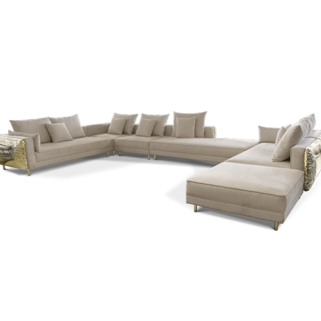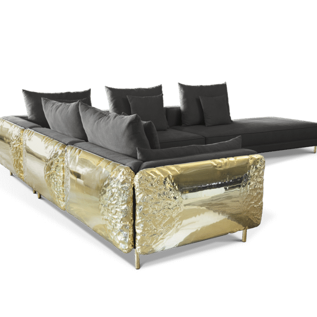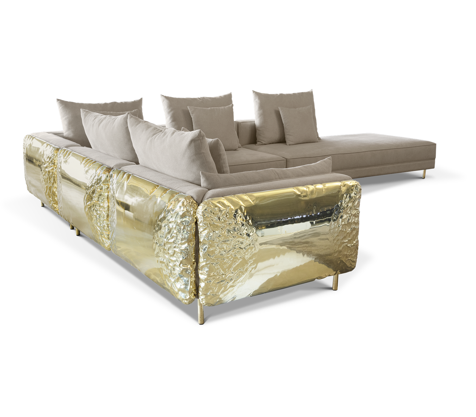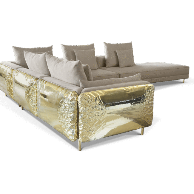 Imperfectio modular sofa is composed of a linear L-shaped sofa paired with upholstered ottoman. The solid wood structure is enveloped by irregular polished brass, founded on elegant slim brass feet. Available in wide selection of natural and bright colors.