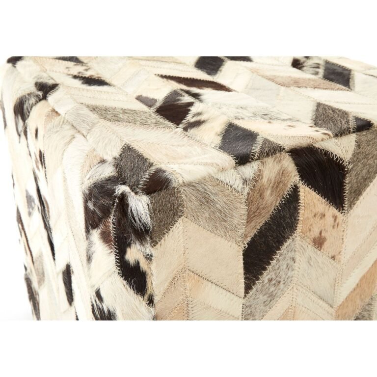 The Affril Black / White Patchwork Pouffe is crafted by hand, each patch painstakingly stitched with white thread to produce a geometric chevron pattern. The use of genuine cowhide makes this a tactile accent piece for the living room or bedroom. The colours are predominately black and white, interspersed with hints of brown and grey. *This product is made from genuine cowhide. Individual units are likely to have slightly different colours, textures, or markings from the image as this is a natural material*