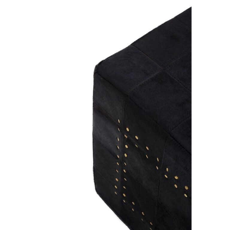 Affril Pouffe With Stud Detail: This pouffe is made from genuine cowhide leather with black patchwork texture.The warm metallic, square pattern stud detail lends the design a luxe accent and harmonises with the square shape.