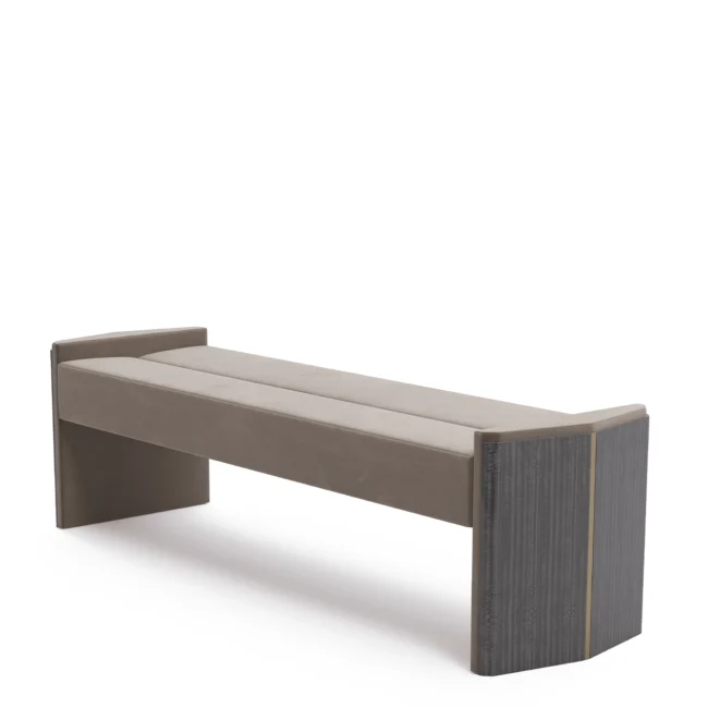 Algerone Ottoman is an ottoman in neutral and warm tones designed to bring more character into any space. It was meticulously handcrafted and upholstered in brown velvet while also presenting details in brass and glossy Eucalyptus Frisé Veneer. A luxury item that is rather adaptable to any ambiance or style.