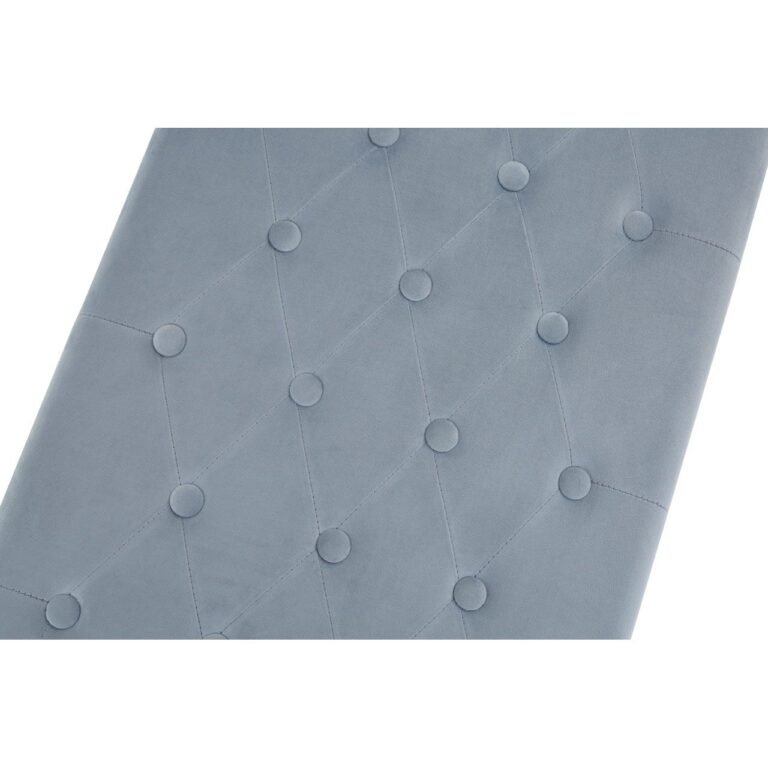 The plump cushion is dressed in soft velvet, with a button tufted finish that creates a quilted finish. The Alia Gold / Powder Blue Velvet Bench base is made from smooth stainless steel and boasts a reflective gold finish that complements the upholstery. Angled lines dart across the base, adding a little bit of geometric design to the aesthetic.