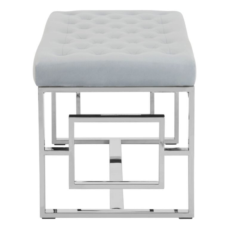Its cushioned seat is upholstered with soft powder blue velvet. The button tufted finish adds a textured look and feel to this stylish accent piece. The Alia Powder Blue Velvet / Silver Bench base is made from stainless steel with a reflective finish that contrasts with the muted powder blue upholstery. Both sides feature a suspended square for added visual depth.