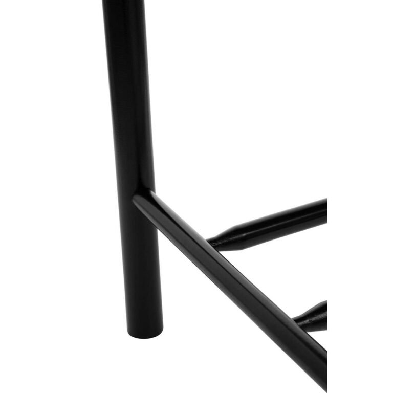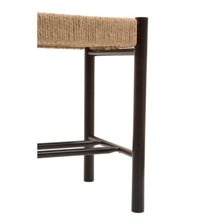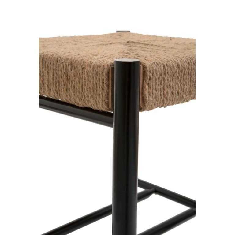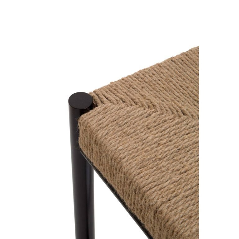 Exhibiting artisan craftsmanship, the seat of this stool is intricately handwoven with hemp rope and efficiently wraps around a black wood frame. The clean-line design adds an angular allure to the area, while the wooden struts bring style and stability.