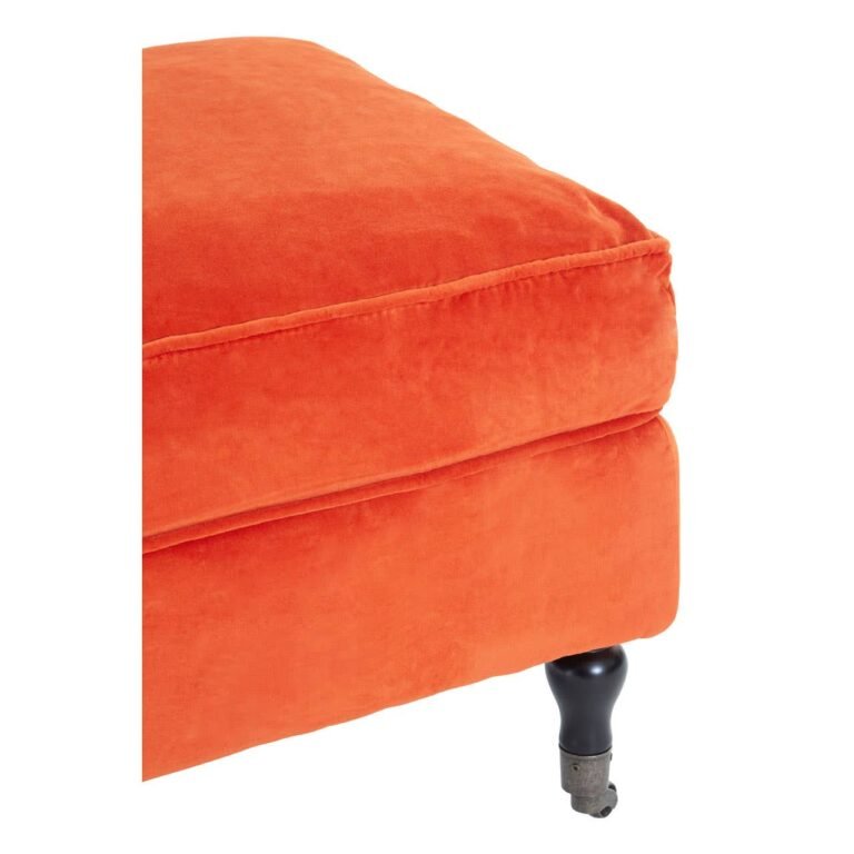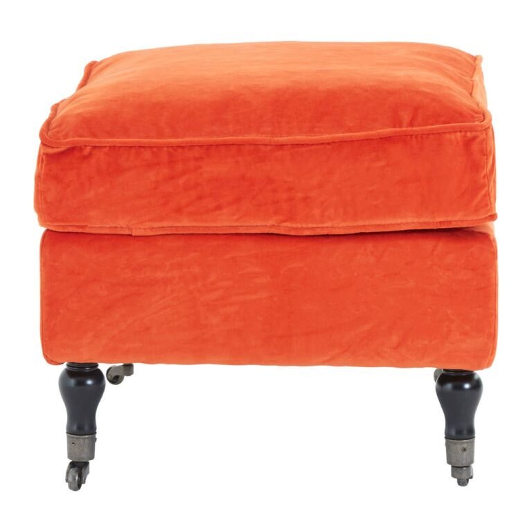This footstool’s soft and inviting top cushion is great for resting weary feet on. Finished in bright orange, its plush velvet upholstery gives it a luxurious feel, and is also easy to maintain. Its black carved legs are made from sturdy birch wood, each with a caster wheel on the end that make it easy to move the stool to wherever it is needed.