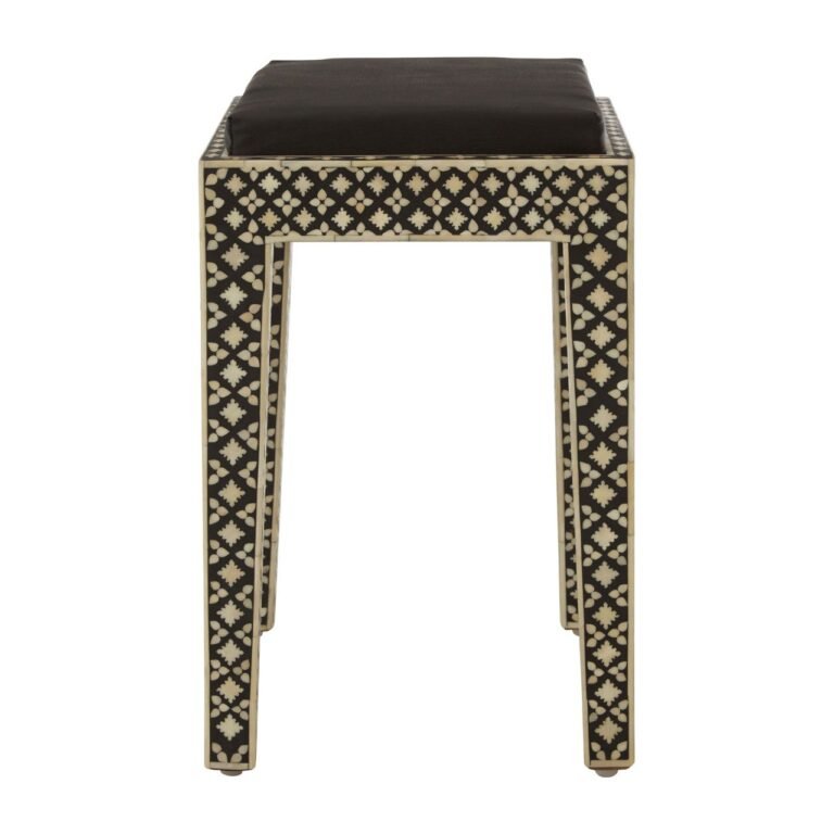 Elm Mother Of Pearl Boho Stool: Ideal for the well-travelled individual, this stool looks great paired with the Boho console table. Its black surface contrasts with the luxurious cream mother of pearl. Both combine to produce a bold and exotic patterned surface. A black leather effect cushion coordinates with the slim black wooden legs.