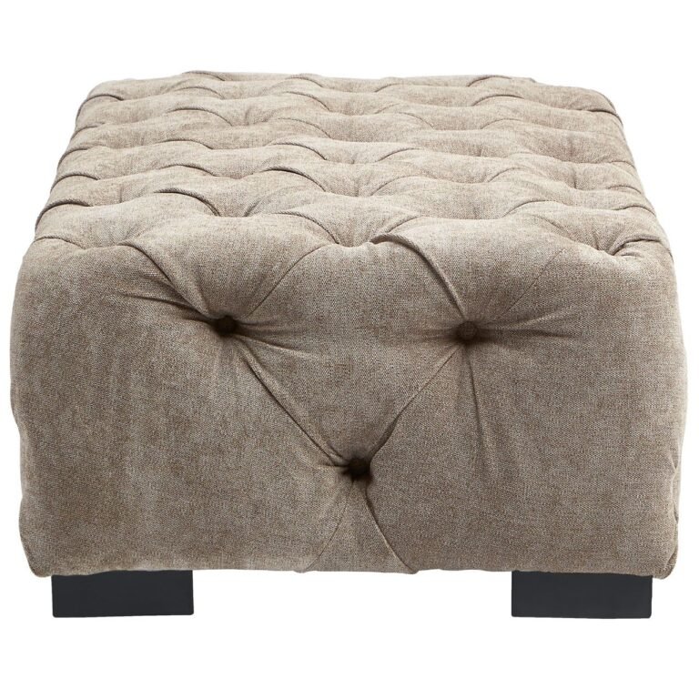 Enton Natural Fabric Footstool: Soft, natural coloured fabric upholsters this stylish footstool, its button tufted design conveying sophistication. The fabric covers a frame crafted from natural wood, which is cushioned with a thick layer of down. Black coloured wooden feet raise the stool from the floor. Pair with the Fenton sofa for a complete coordinated look.