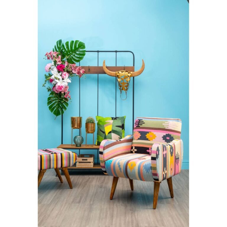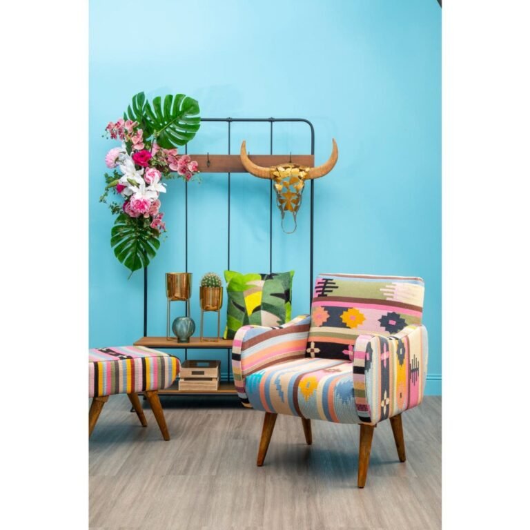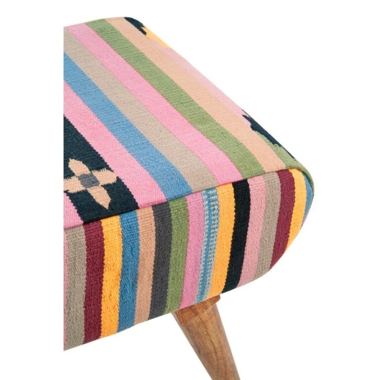 Fena Multicolour Footstool: This footstool is upholstered in premium quality cotton and exhibits timeless multicolour tribal patterns. To ensure a cosy seating experience, the seat is tightly padded with dense foam and supported by natural mango wood legs for stability and durability.