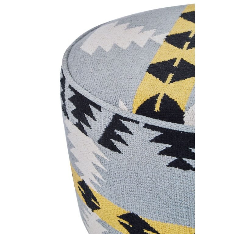 Fena Round Footstool: Compact and sturdy, this modern-looking footstool is made from tactile cotton in a range of colours and motifs. The legs are crafted from solid mango wood, exhibiting the rich brown colour that exudes boho style.