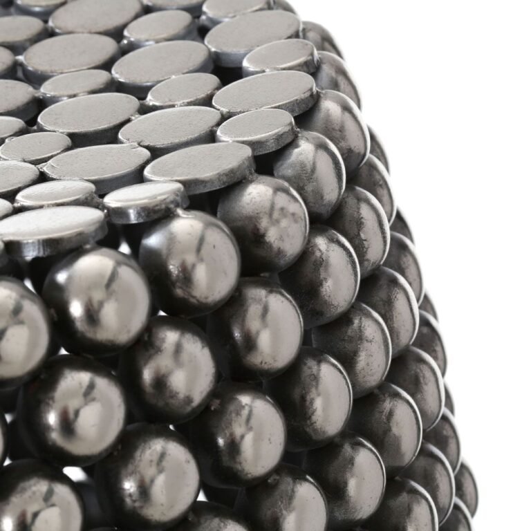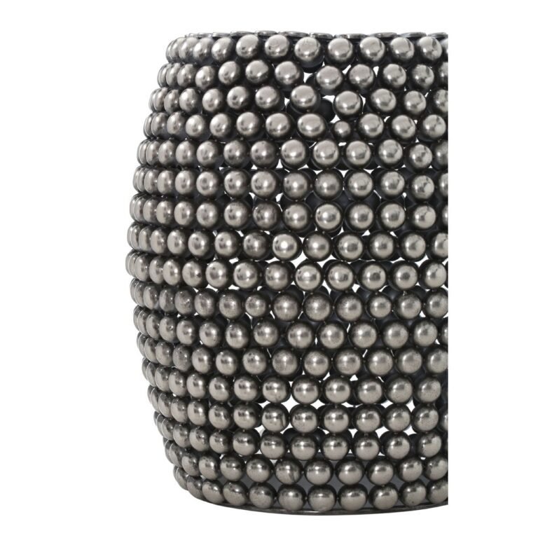 Foxley Round And Beaded Iron Barrel Stool barrel shape is formed from a series of interconnected iron beads, their silver finish making it a flattering partner for reflective metallic accessories. Flattened beads combine to make up its round surface area. Crafted by hand, each unit displays its own unique variations. Coordinate it with eclectic traveller/fusion home furnishings and accessories.