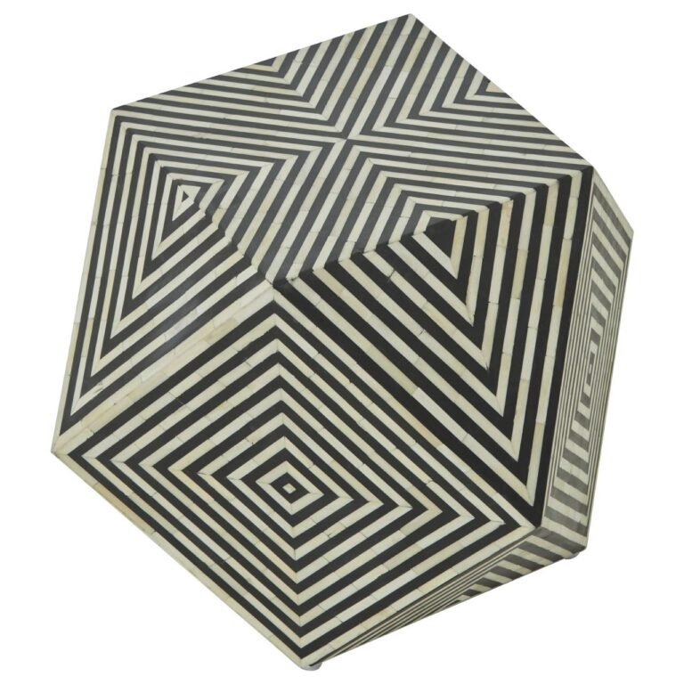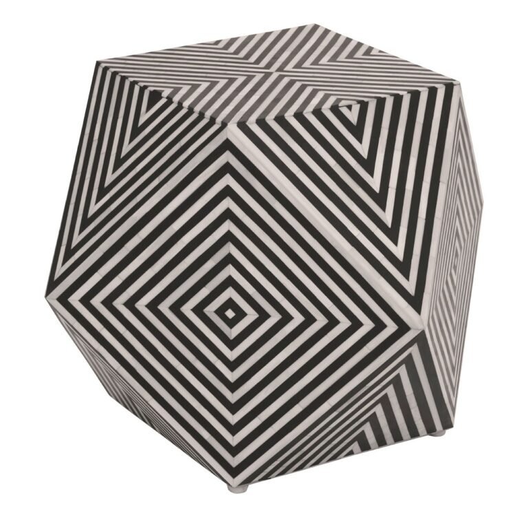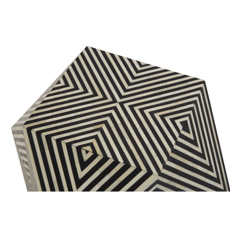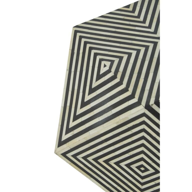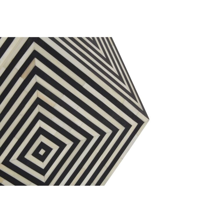 Laniere Buffalo Bone Diamond Stool: Expertly handcrafted, this fusion, diamond shaped stool is formed from black and white bone inlay detailing. The minimal, monochromatic stool table can be styled with coordinating furniture within the boho range.