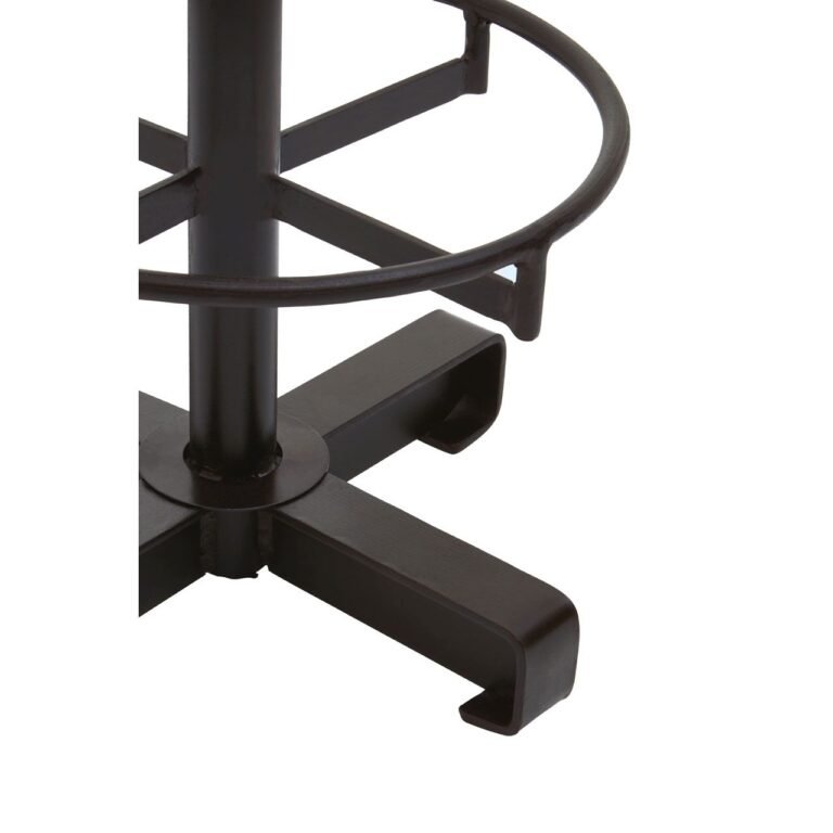 Olk Buffalo Antique Blue Leather Bar Stool: The luxury Buffalo stool uses soft natural leather to upholster its plump round seat. Its tall cylindrical stand is made from tough iron, with a black finish that complements the antique blue leather. Four chunky feet at its base keep it stable, while the wide round footrest with latticed ironwork adds to the comfort.