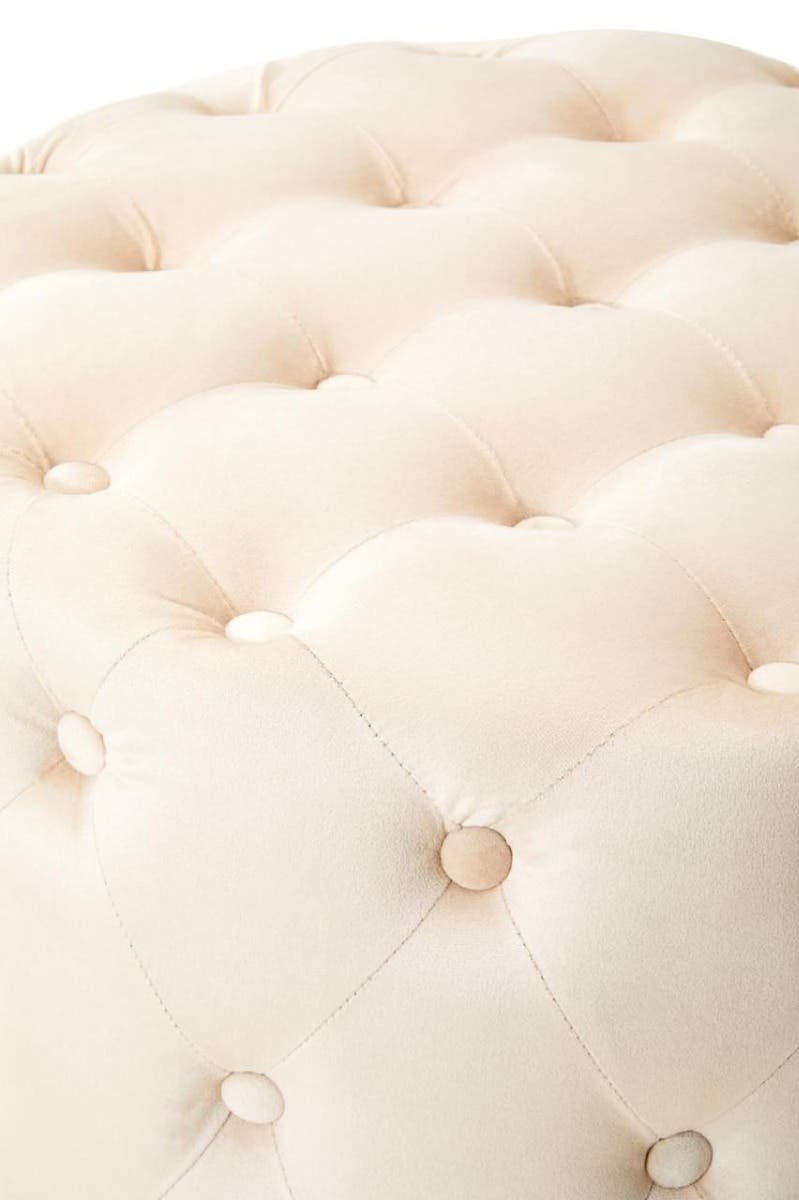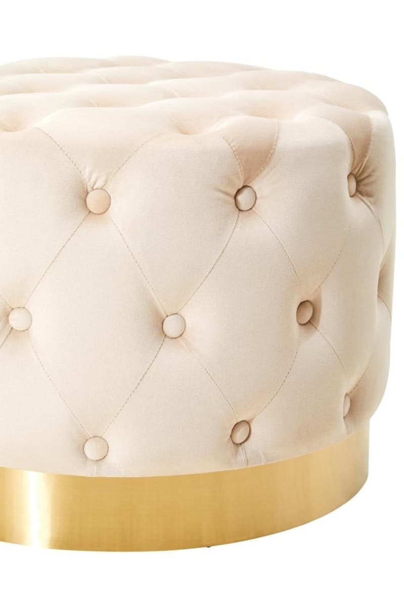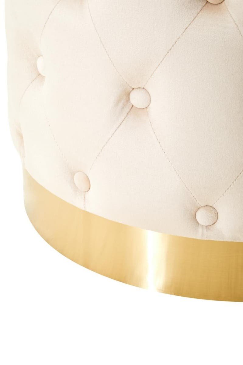 This stool features button tufted plush velvet upholstery suitable for luxury decors. The sleek matte gold finish metal base contrasts elegantly with the stone velvet, making the stool an opulent accent piece.