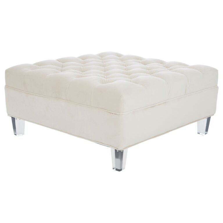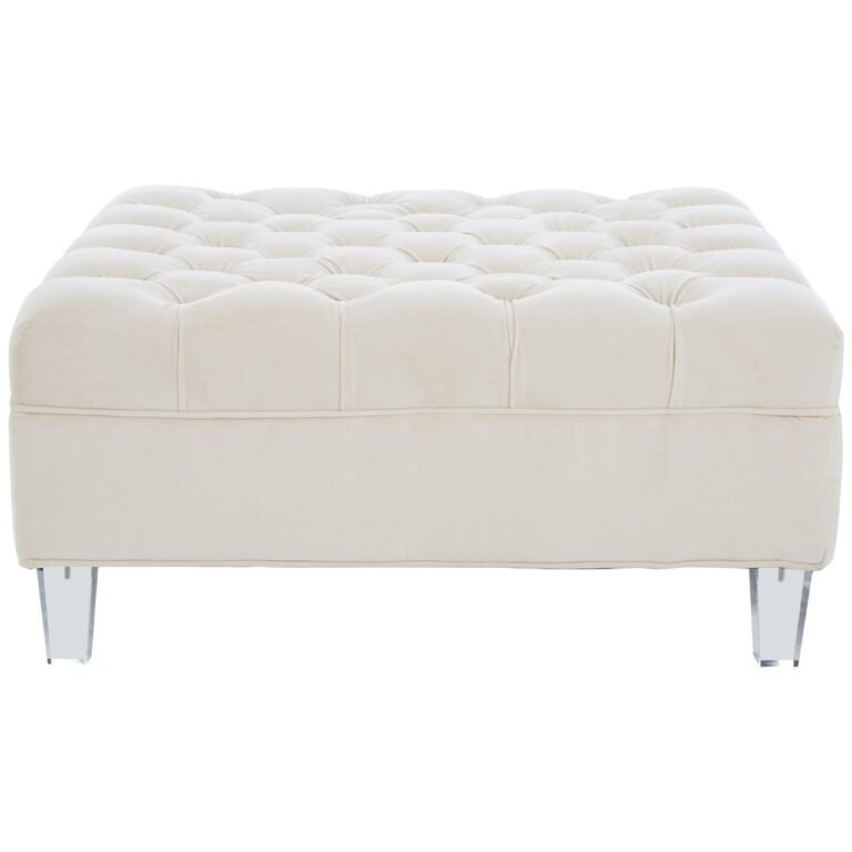 Reilv Footstool: This ottoman is upholstered in sand fabric which gives it a soft, muted look. Button detailing on the surface is hand tufted to enhance the thick padding of the seat. The seat lifts to reveal useful storage space. Tapered perspex legs introduce a contemporary accent to this traditionally-inspired accent piece.