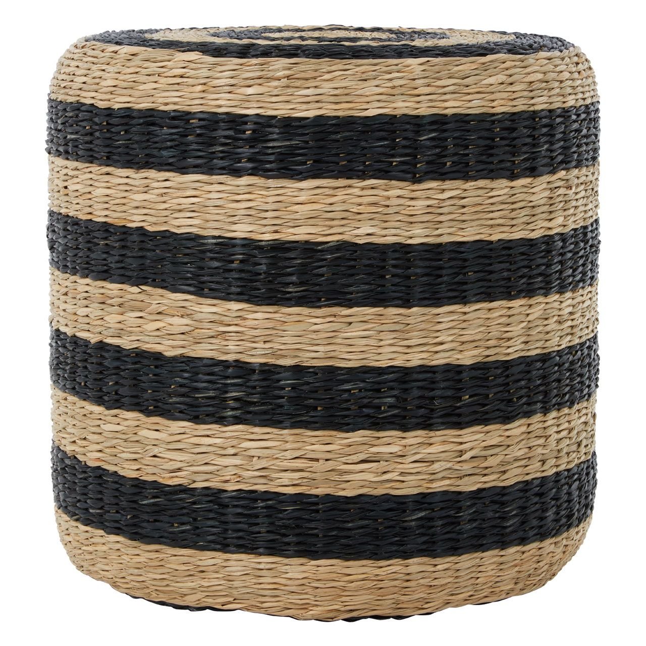 Crafted from renewable seagrass fibers, this round pouffe is neatly hand-woven and features a tactile texture. The black finish stripes on the top and sides contrast its natural accent and give it a decorative appeal. The intricate weave pattern coupled with rounded aesthetic enhance its stylish look.